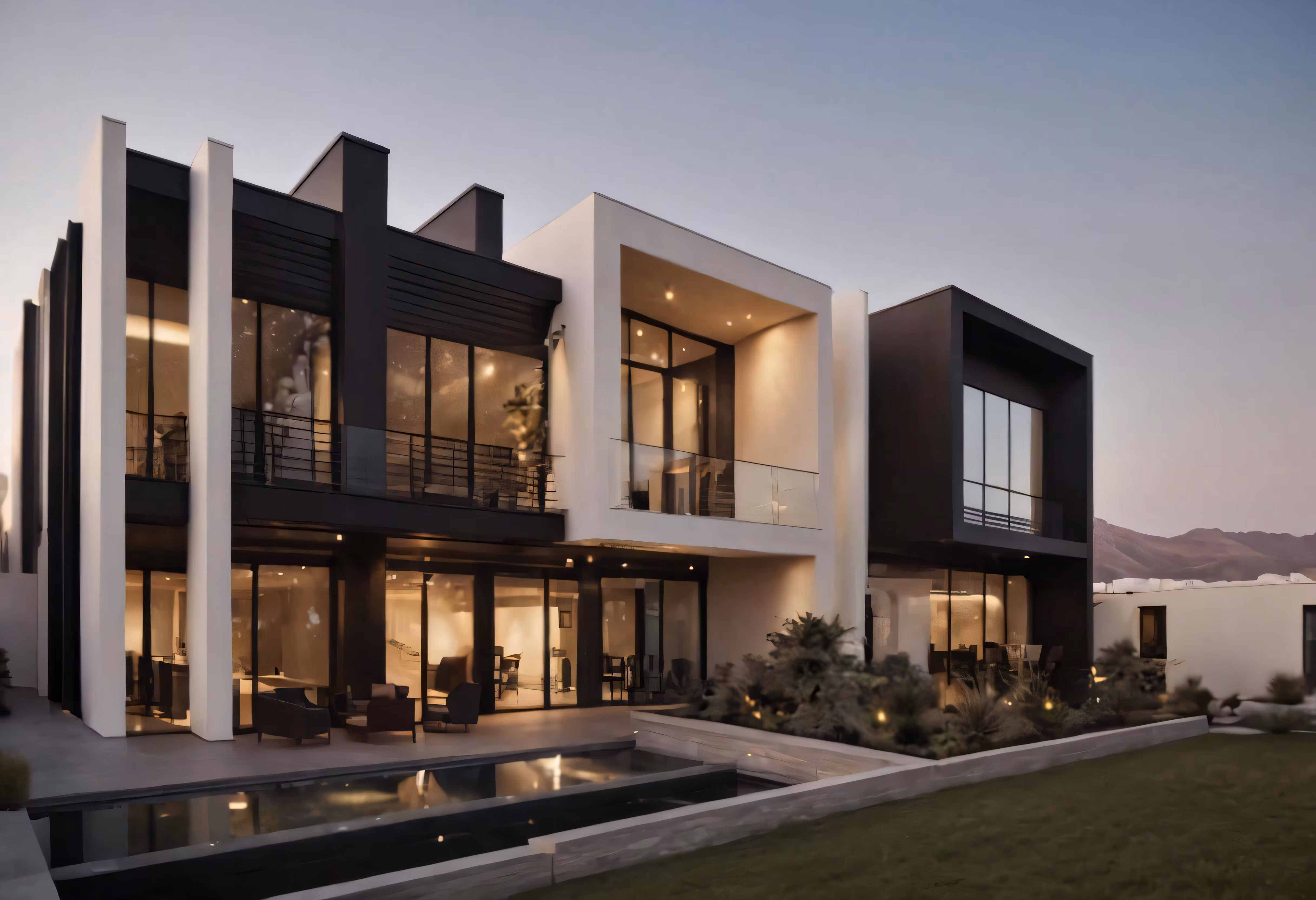 High resolution picture, free to use, a modern residence at dusk in a private setting