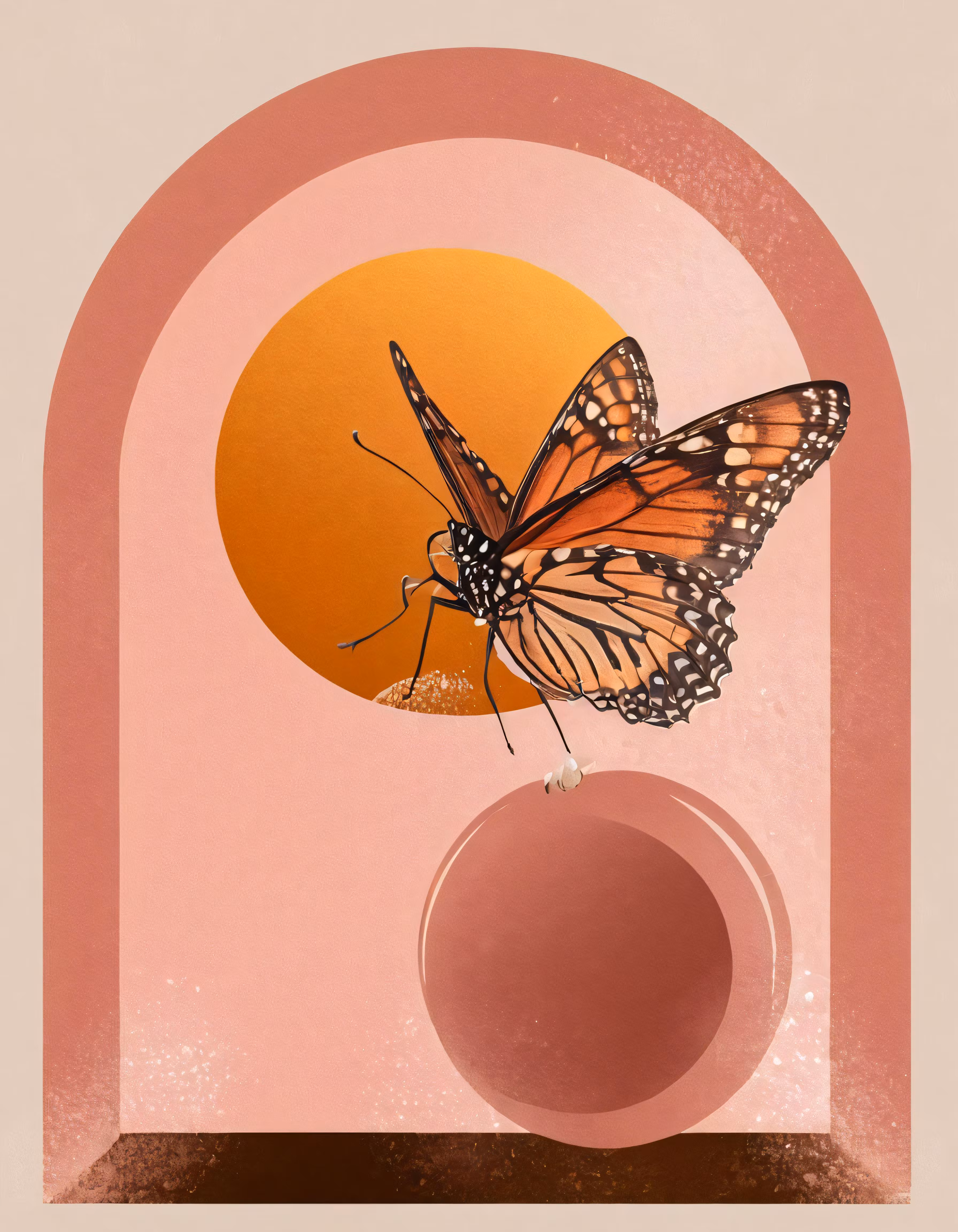 High resolution picture, free to use, a monarch butterfly flying on an orange and pink sphere