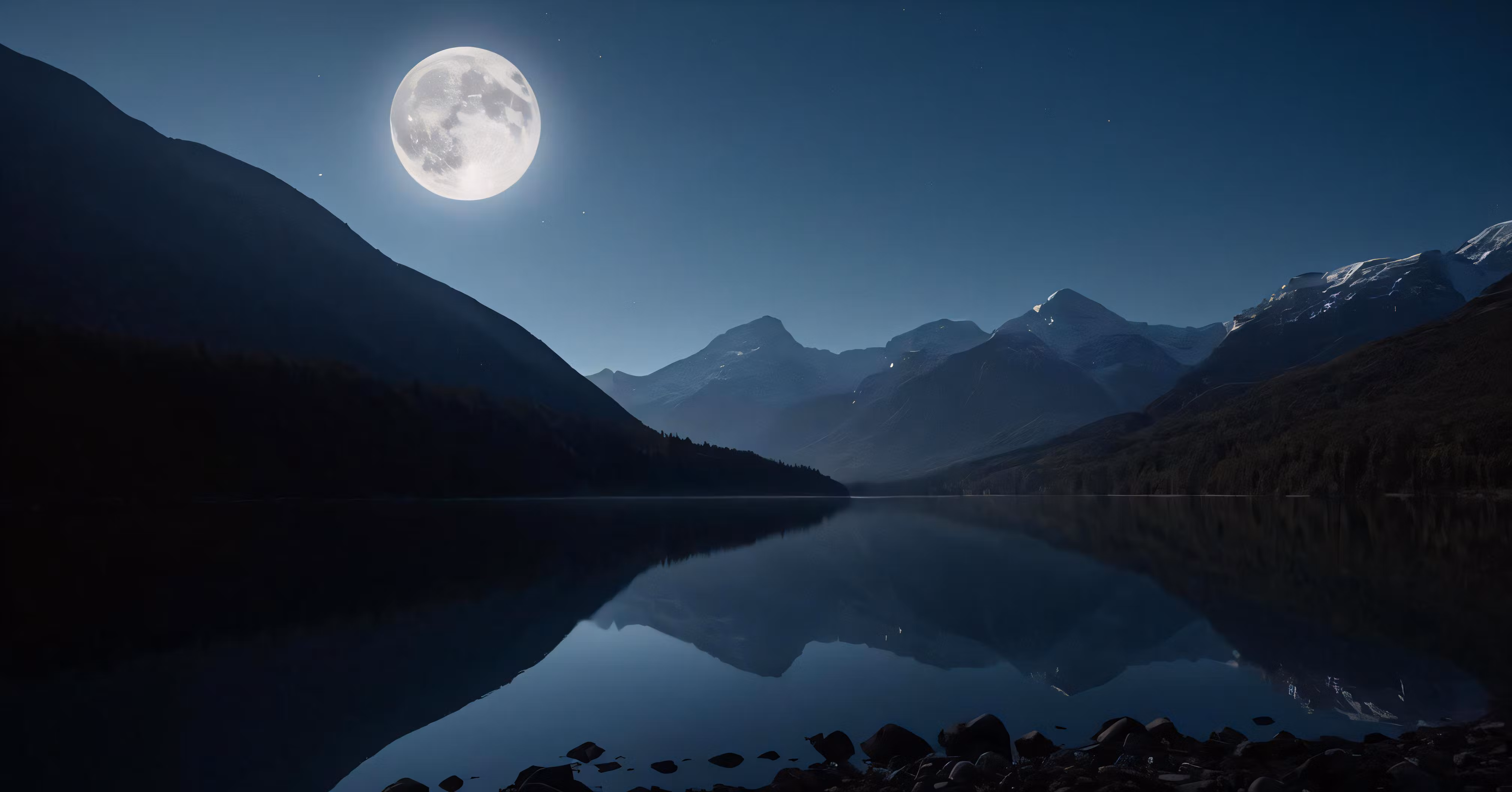 High resolution picture, free to use, a moon sits above mountains and a body of water