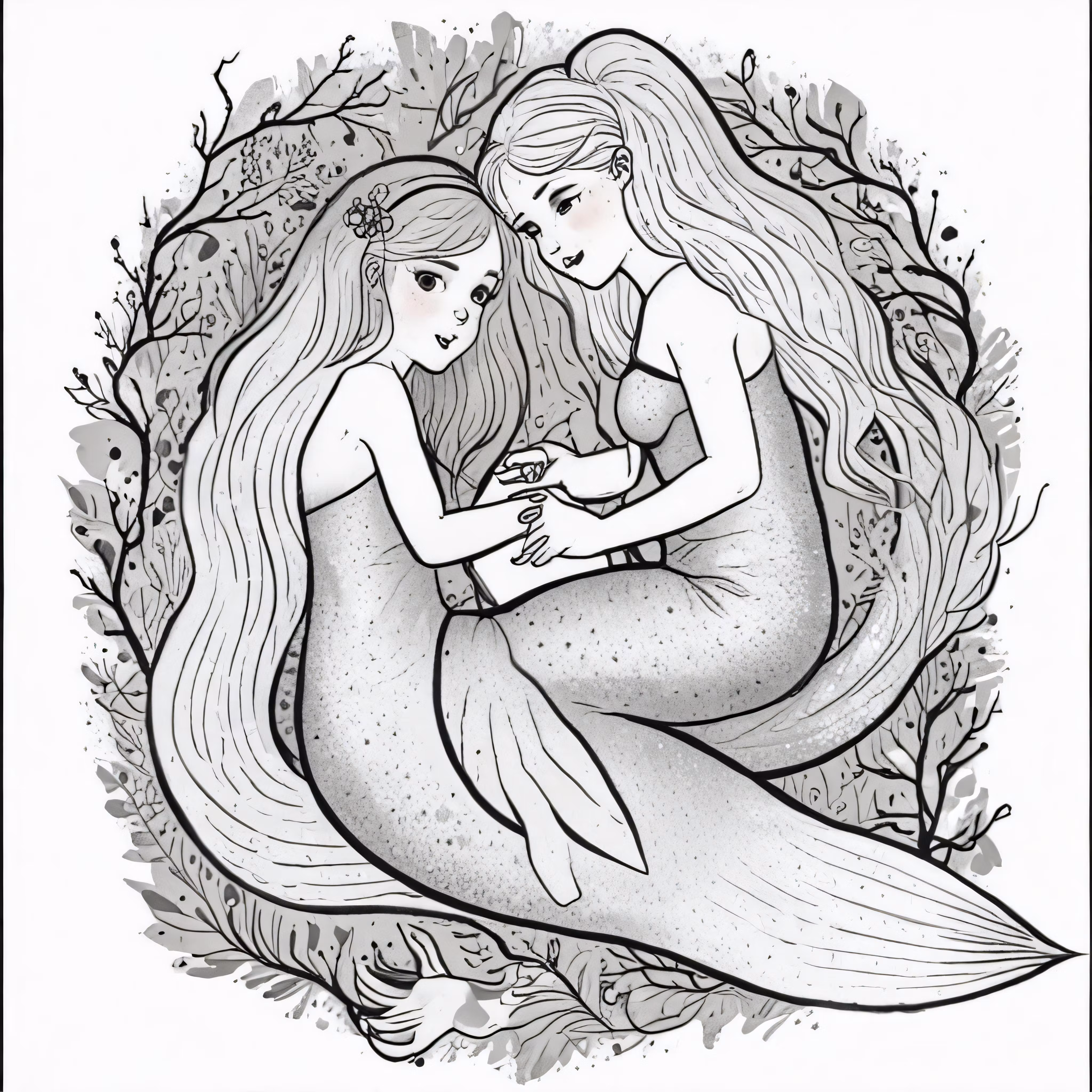 High resolution picture, free to use, a mother and child mermaids sitting in the water