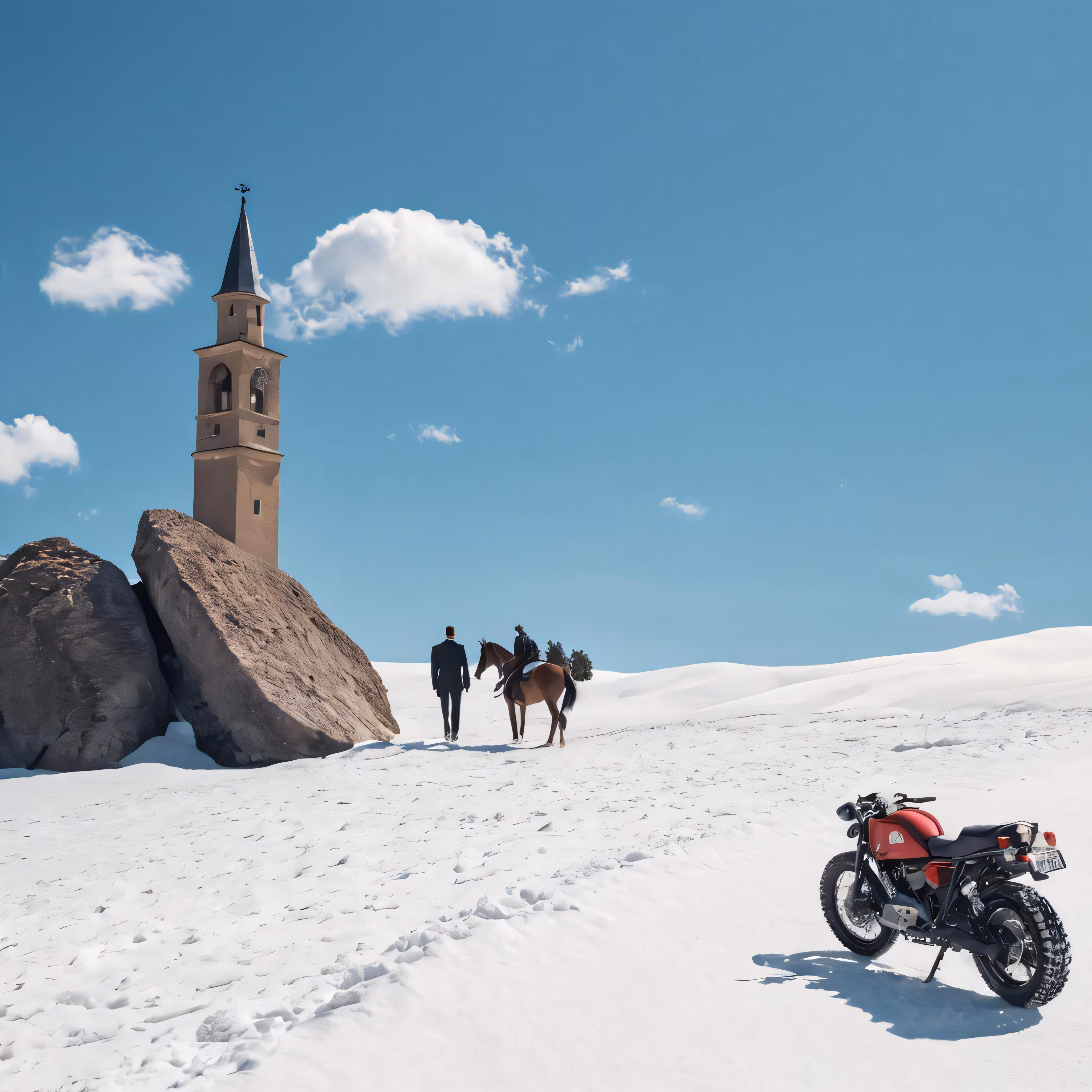 High resolution picture, free to use, a motorcycle parked in the snow with a group of people walking next to it