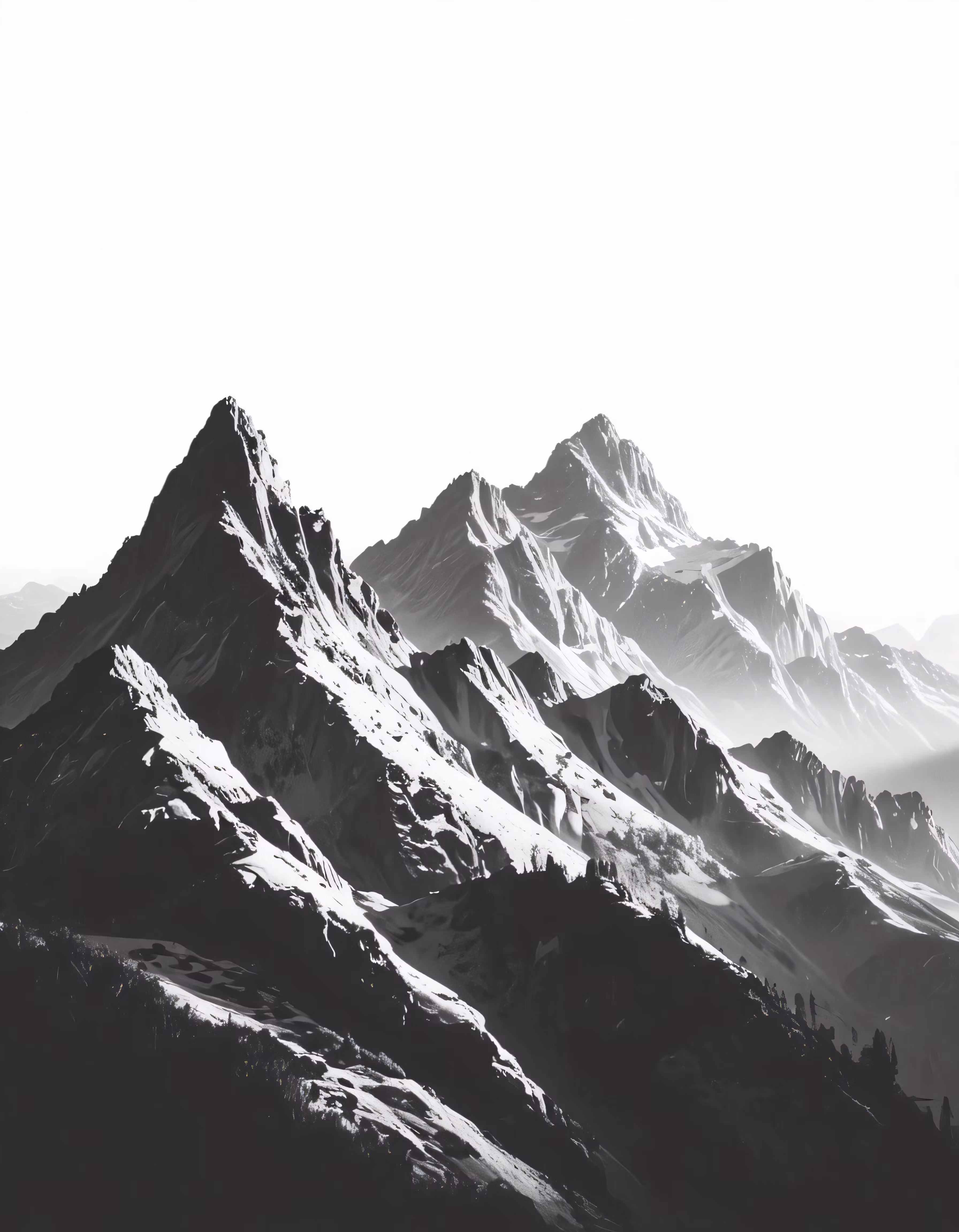 High resolution picture, free to use, a mountain range of trees and snow, in black and white