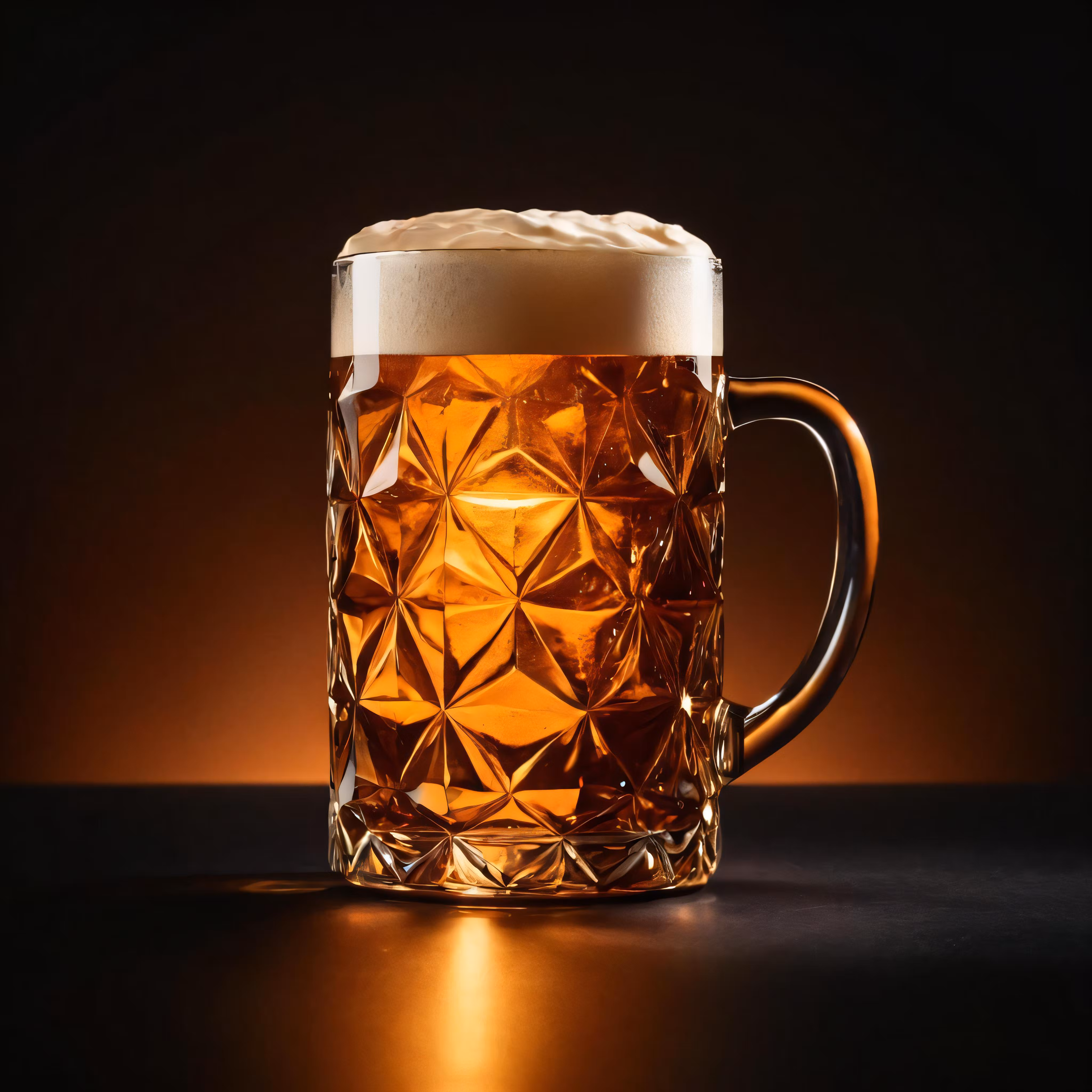 High resolution picture, free to use, a mug of beer with foamy content sits on a reflective surface