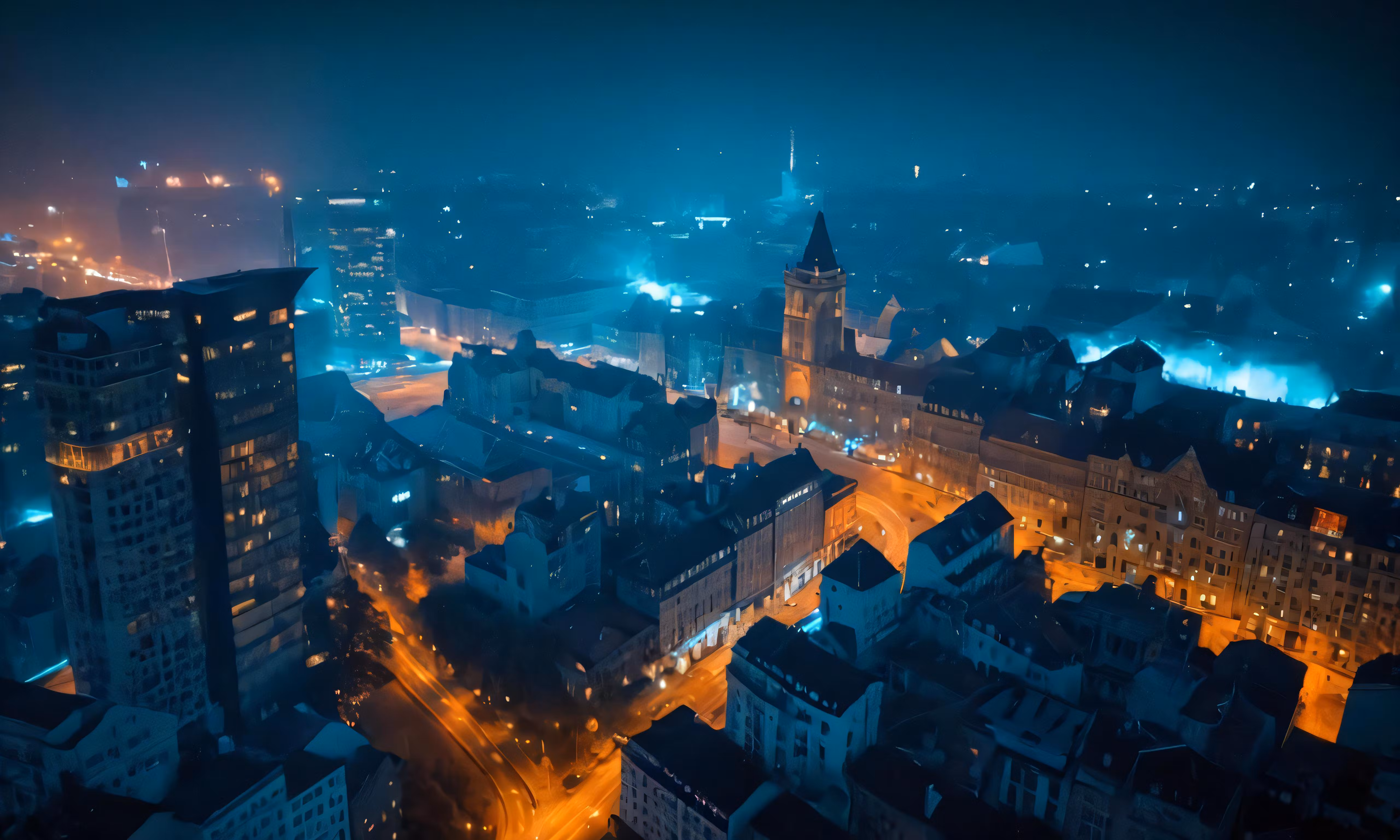 High resolution picture, free to use, a night view of a city with buildings and street lights