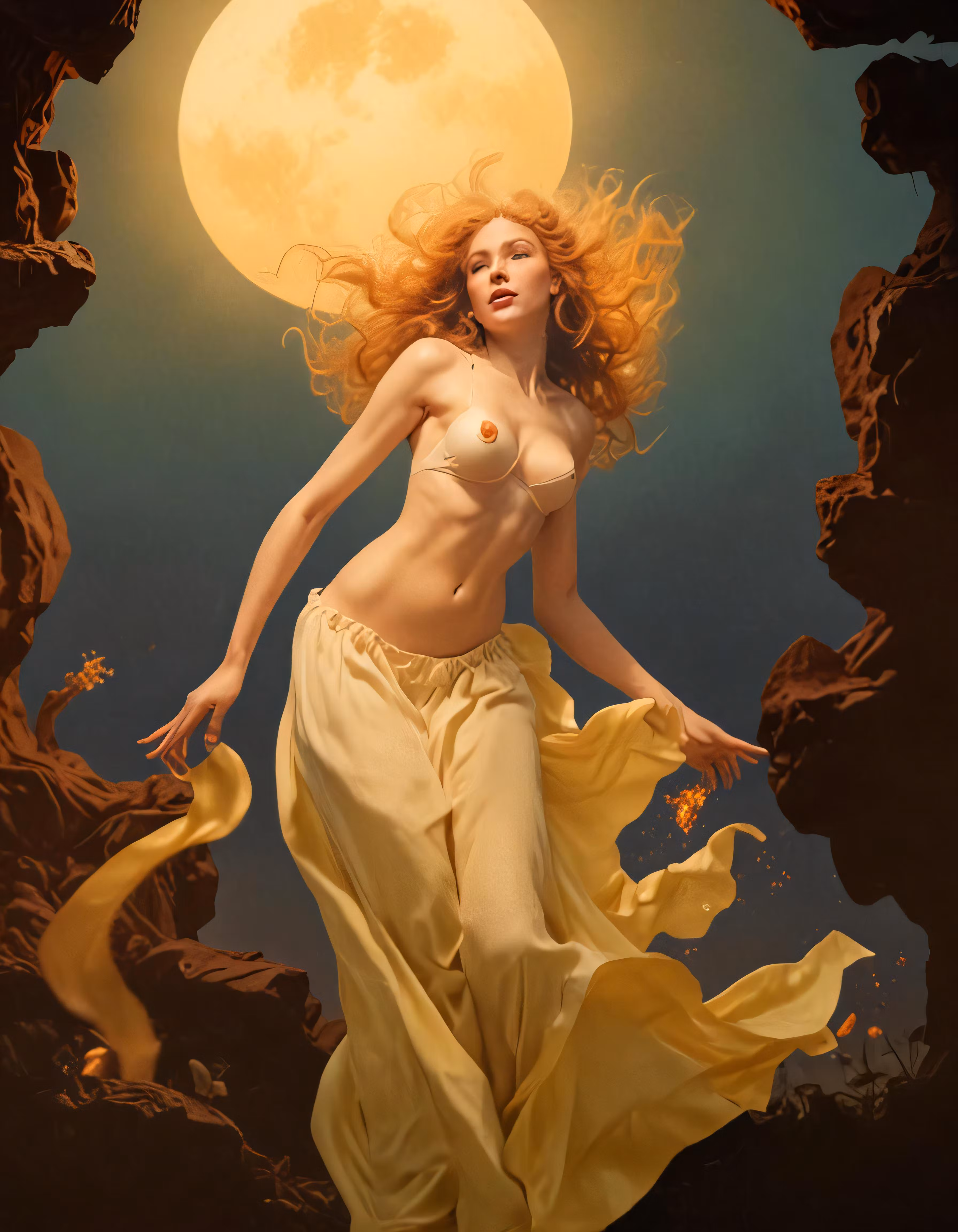 High resolution picture, free to use, a nude woman in yellow outfit standing beneath a full moon
