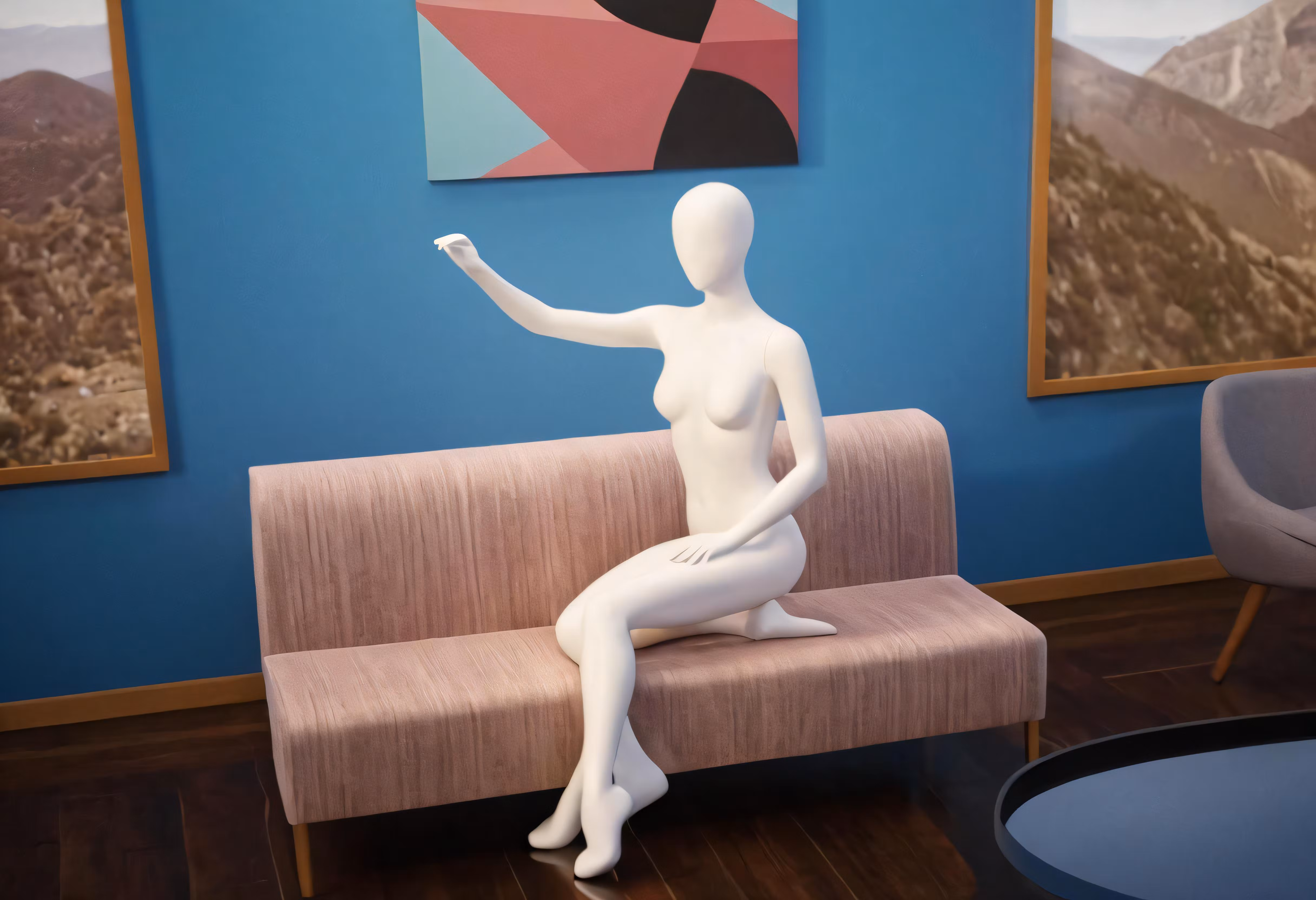 High resolution picture, free to use, a nude woman sitting on a bench with a modern blue wall