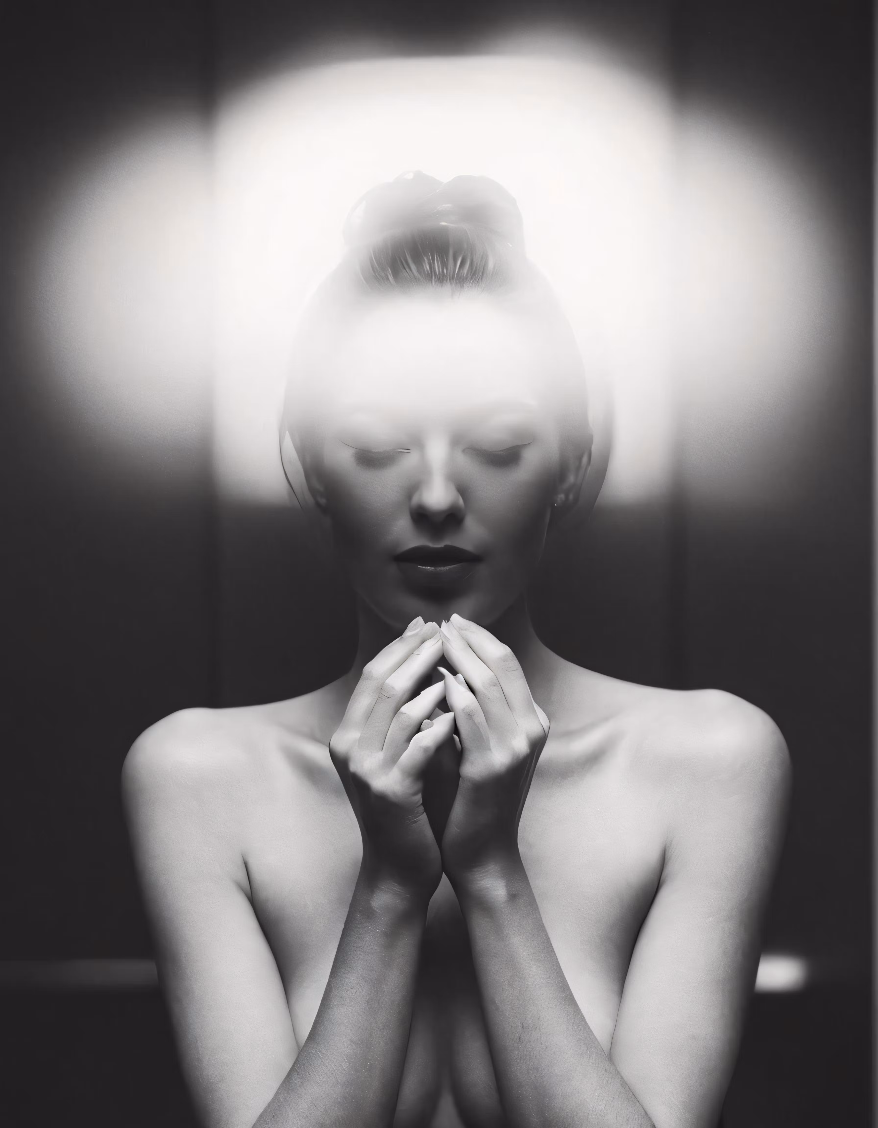 High resolution picture, free to use, a nude woman with her hands clasped on her chest