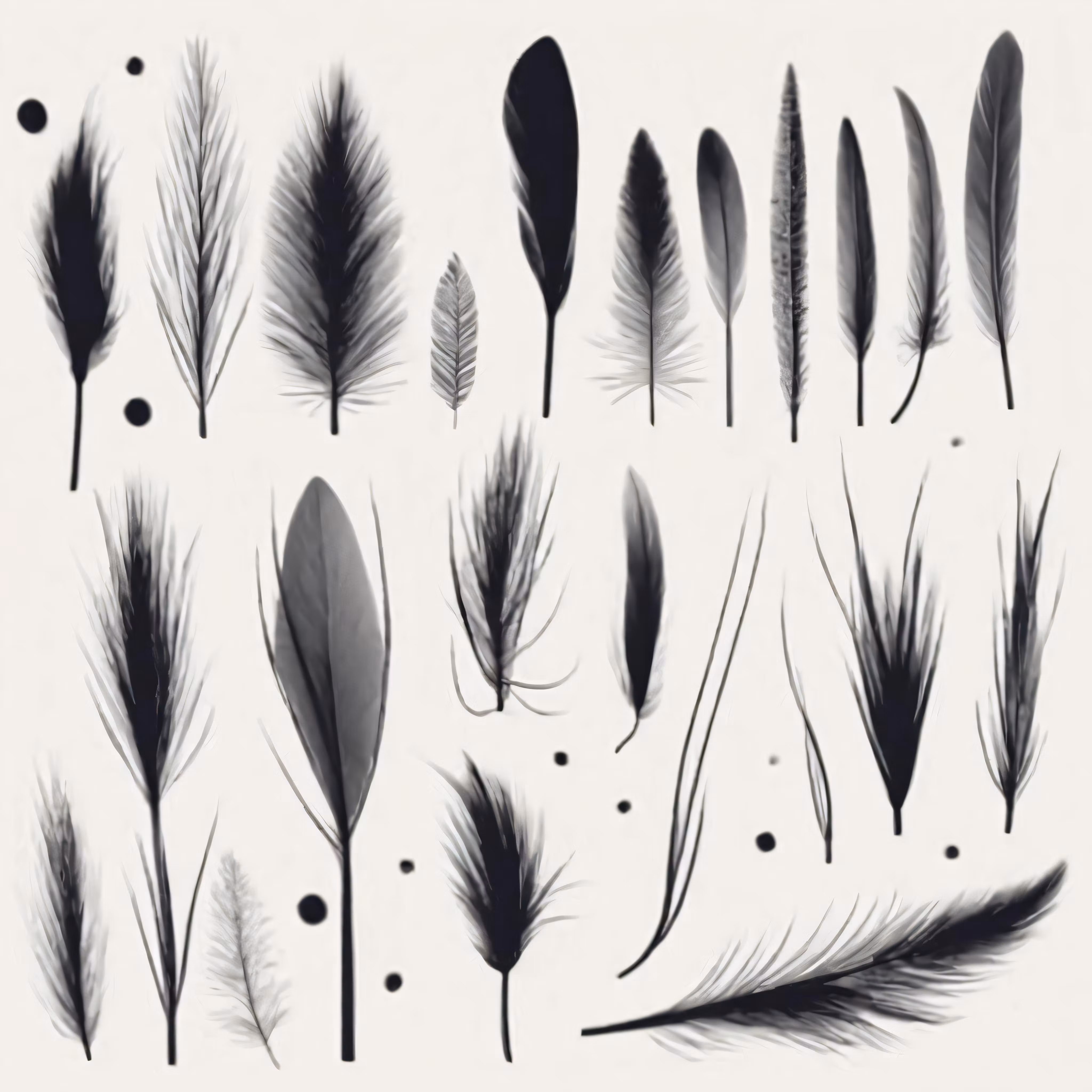 High resolution picture, free to use, a number of different types of feathers on a white background