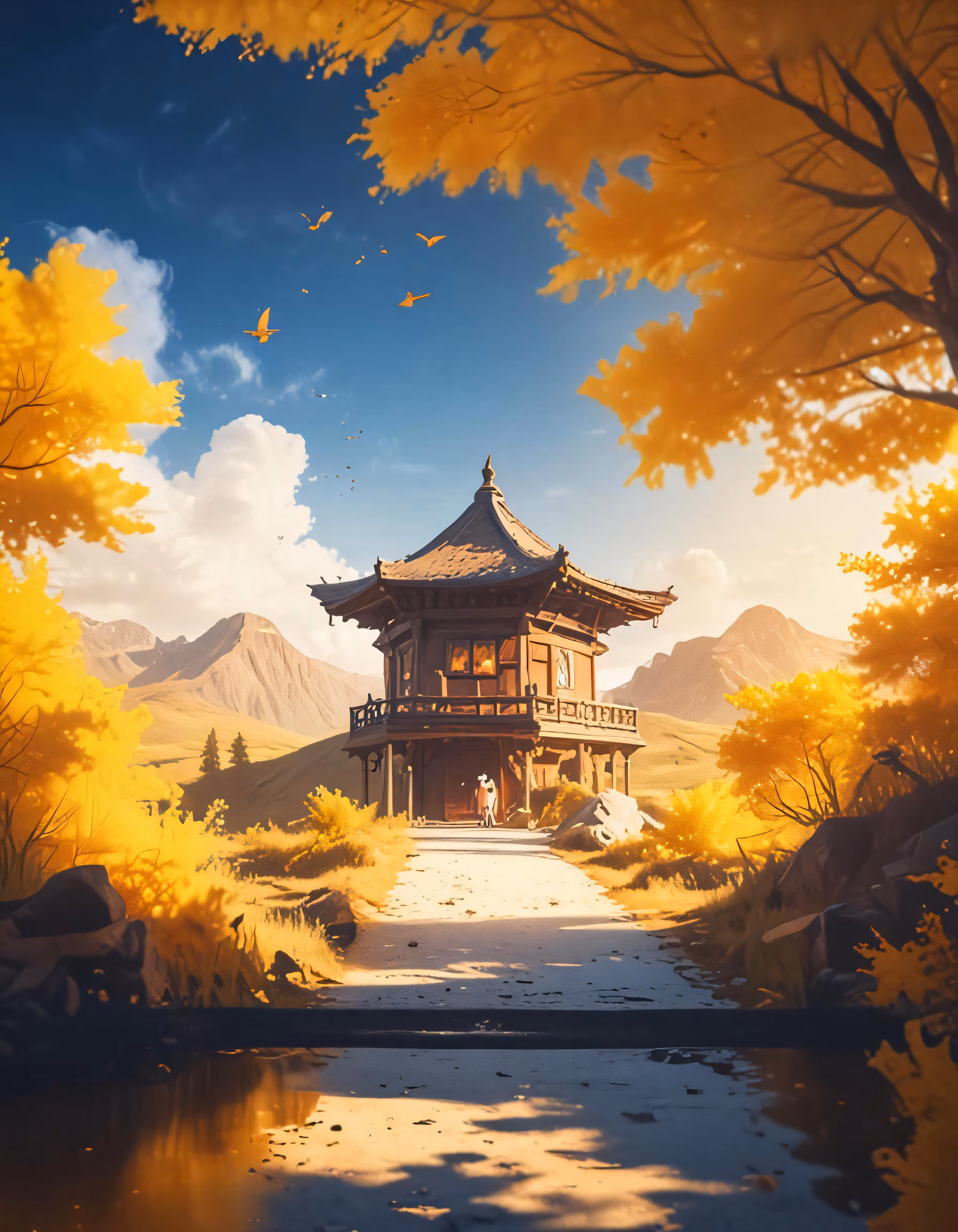 High resolution picture, free to use, a pagoda with yellow trees and a body of water