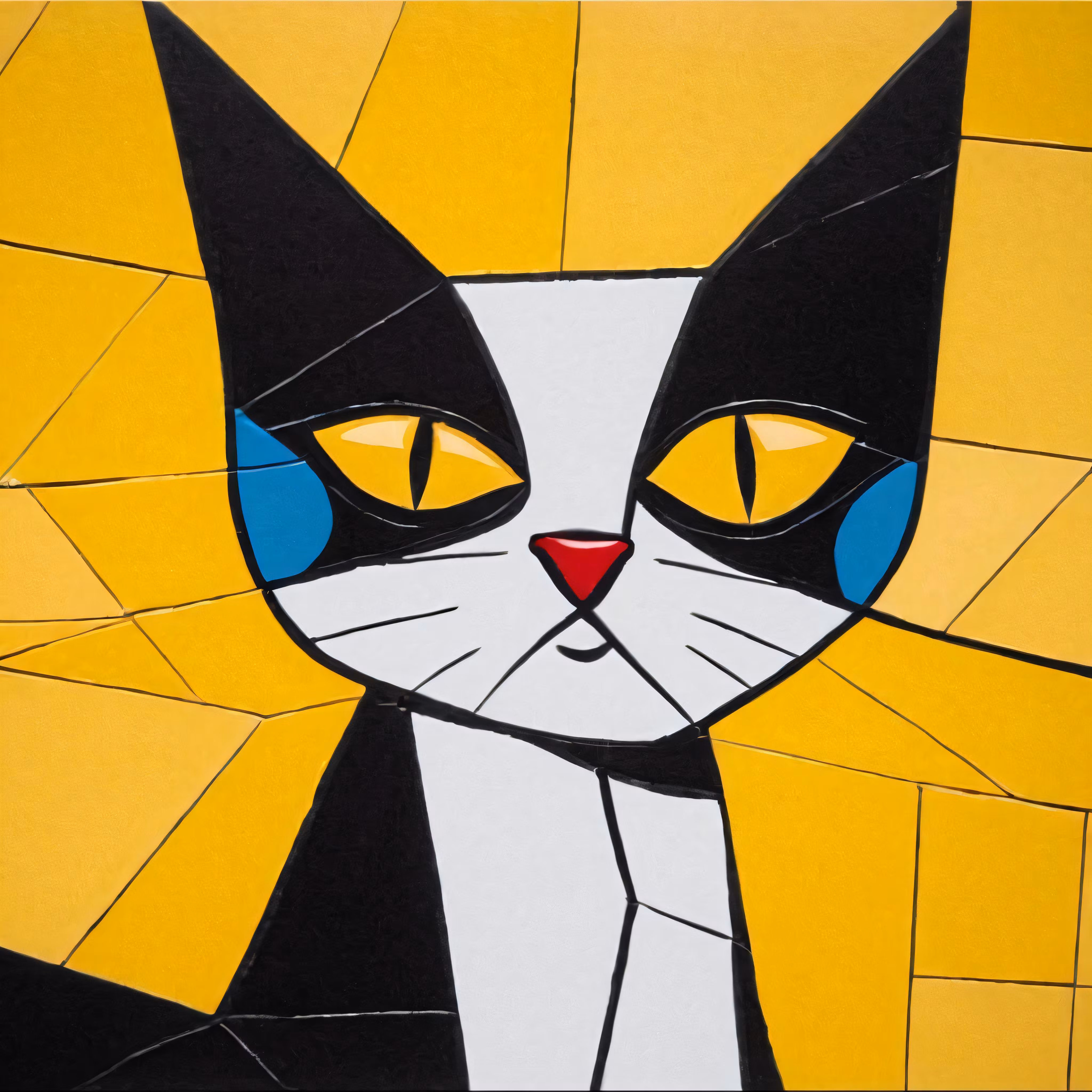 High resolution picture, free to use, a painting depicting a black and white cat with yellow eyes