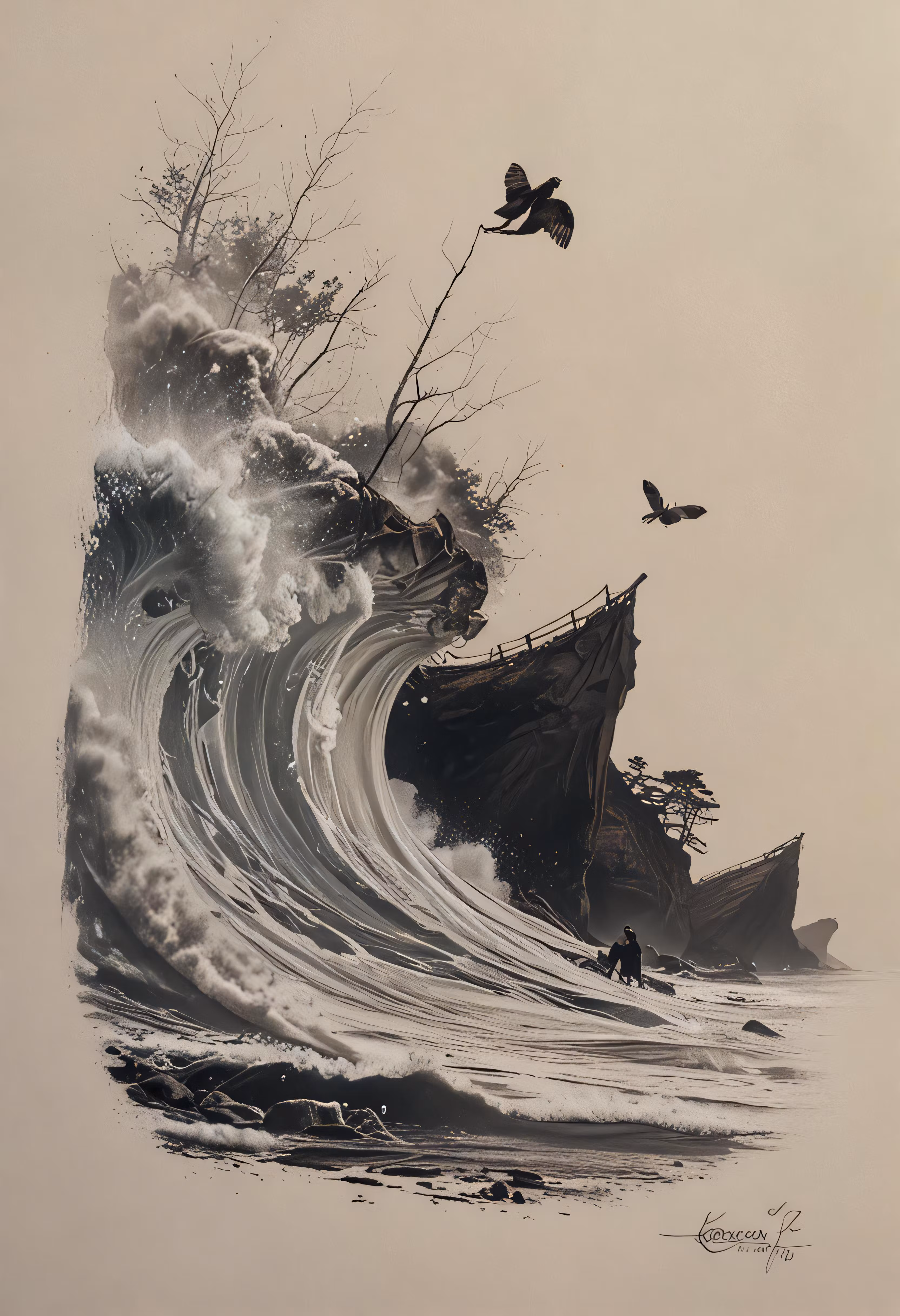 High resolution picture, free to use, a painting of a boat in the ocean crashing