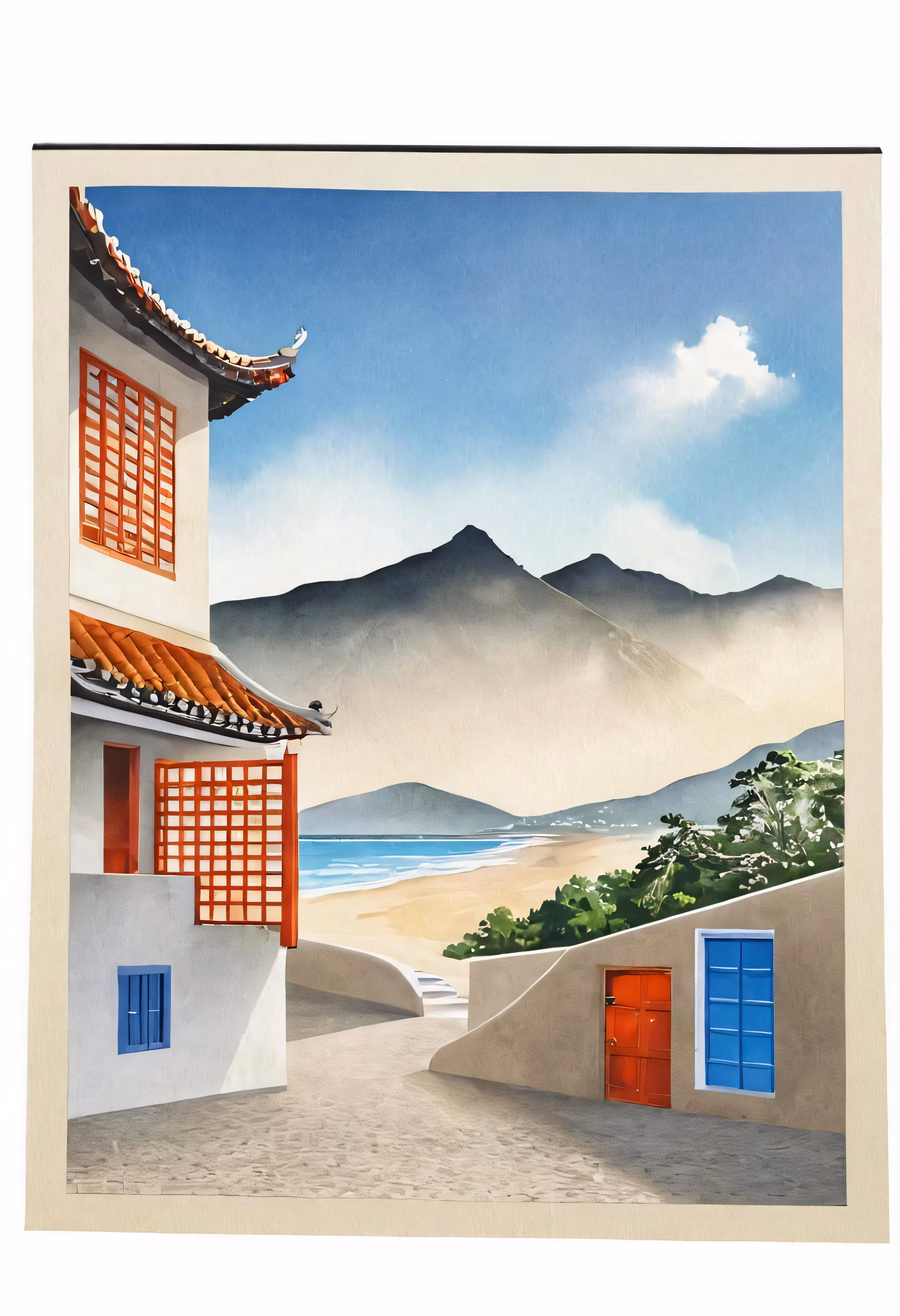 High resolution picture, free to use, a painting of a building overlooking the beach and hills