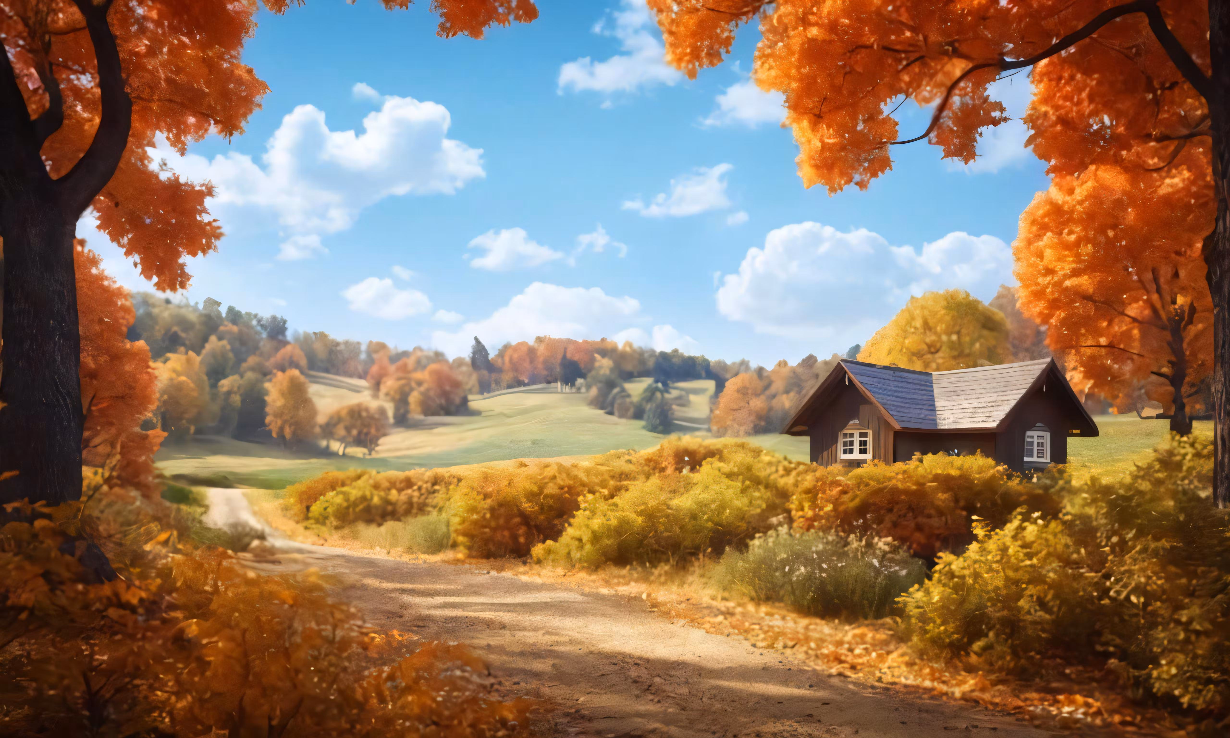 High resolution picture, free to use, a painting of a cabin in a field on a fall day