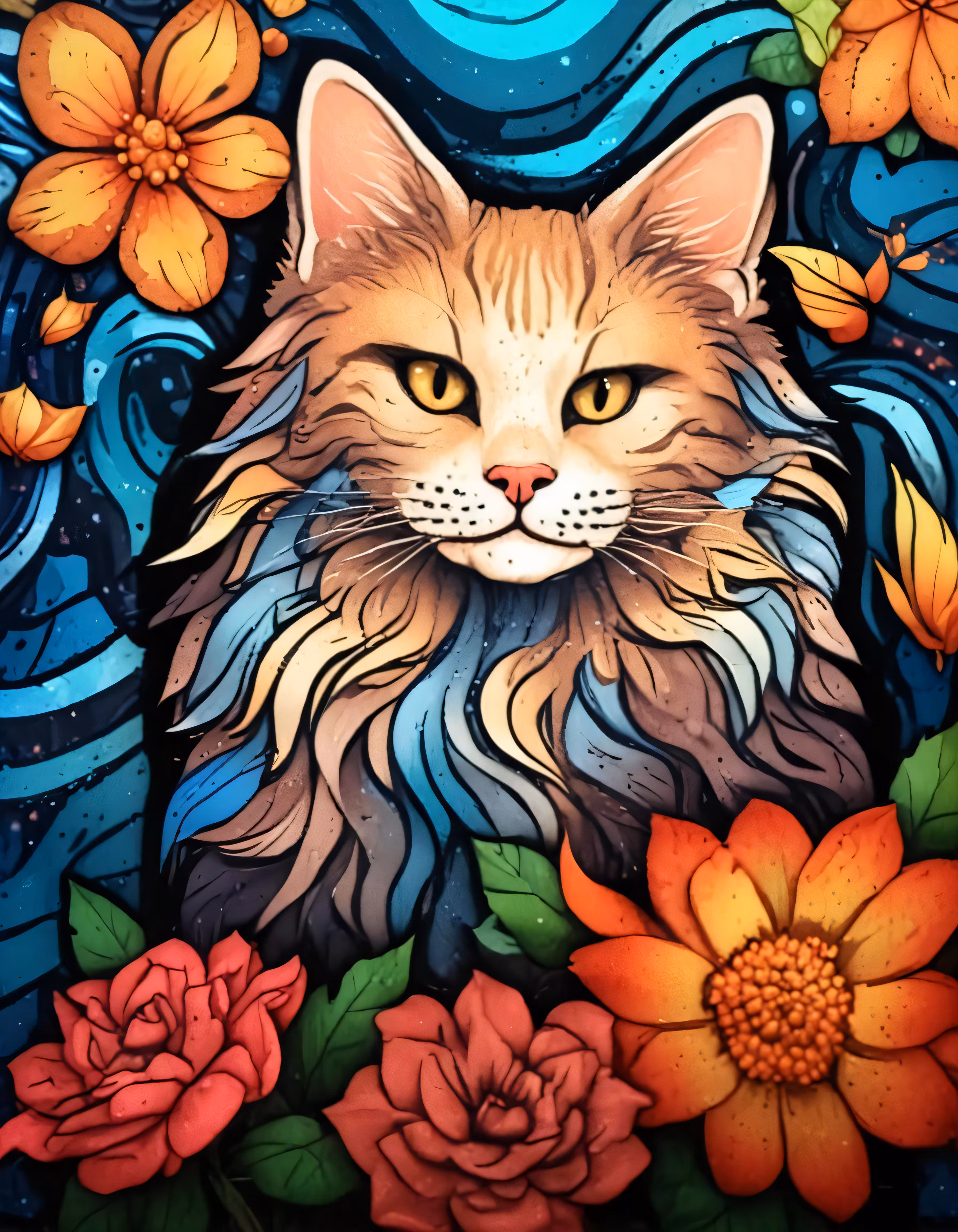 High resolution picture, free to use, a painting of a cat with flowers around it
