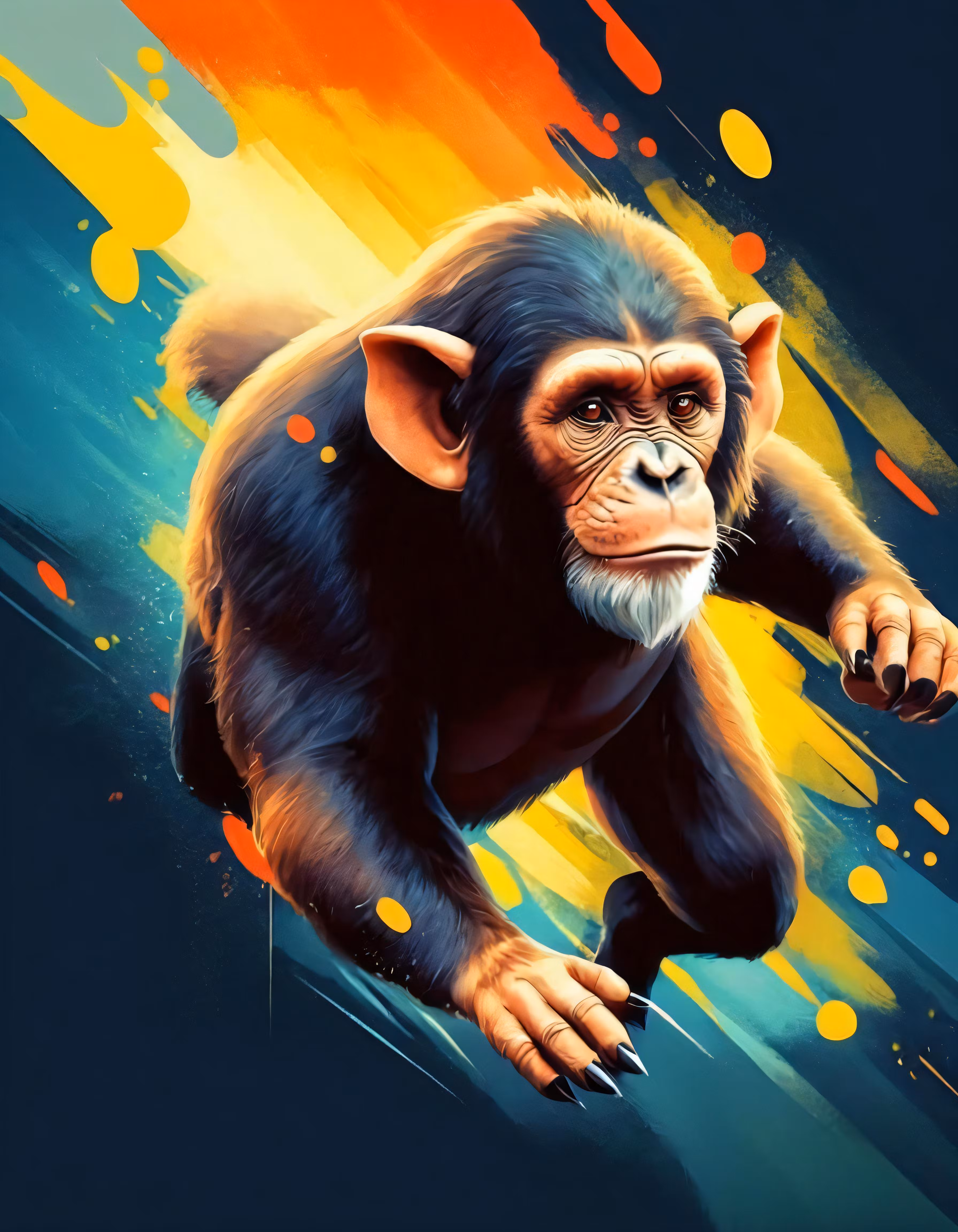 High resolution picture, free to use, a painting of a chimpan looking like he is jumping