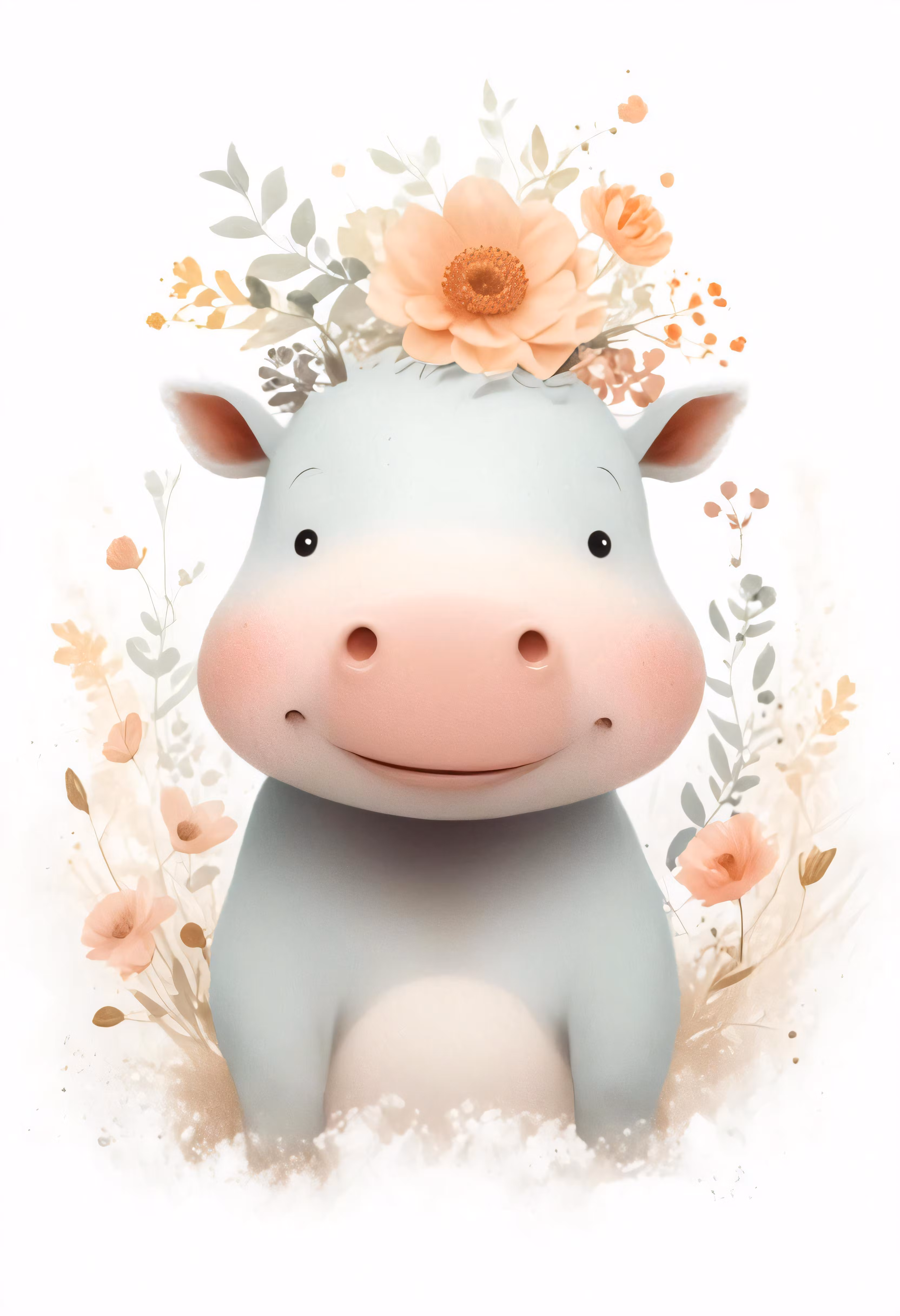 High resolution picture, free to use, a painting of a cow sitting with flowers on its head