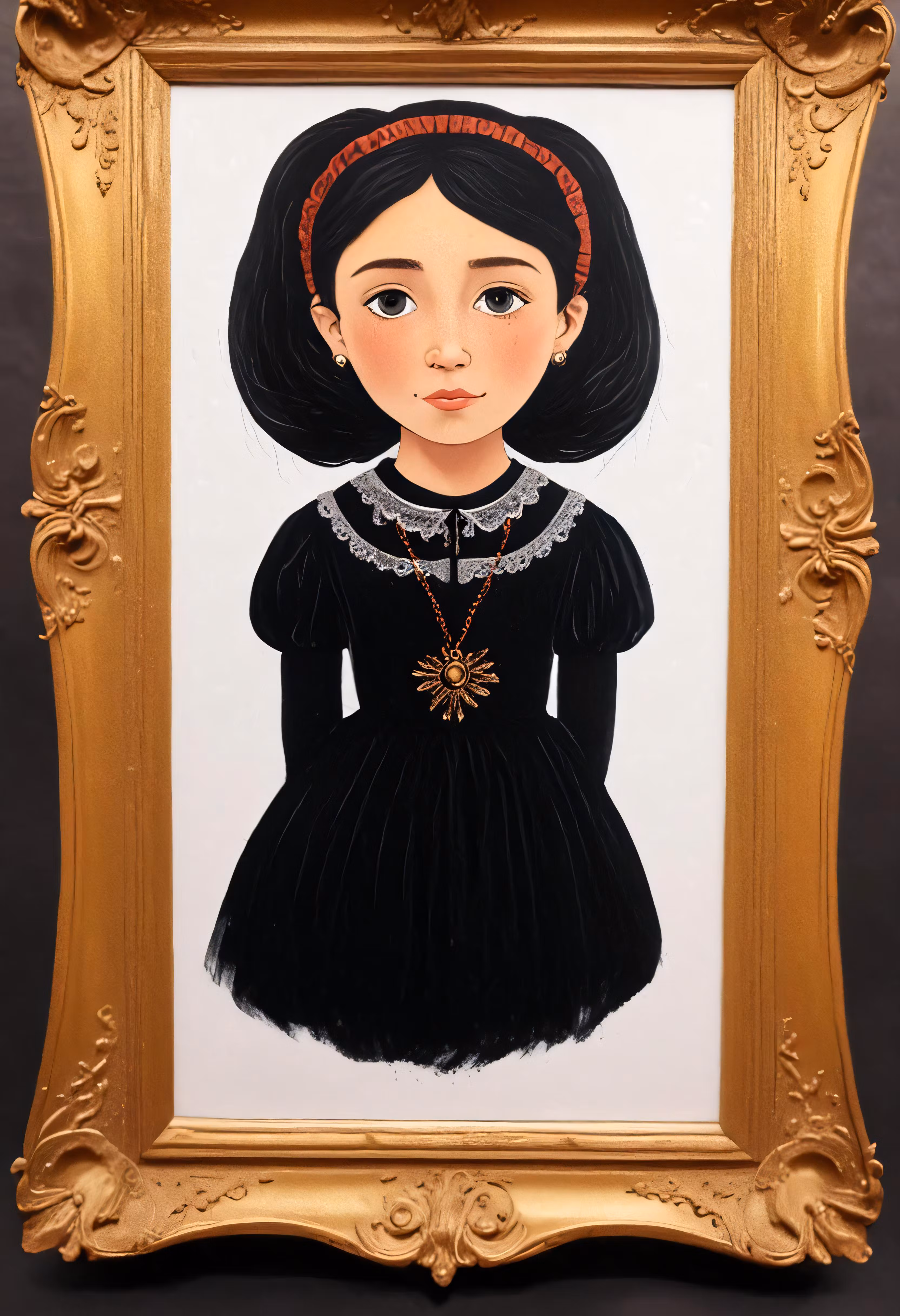 High resolution picture, free to use, a painting of a girl with black hair in a gold frame