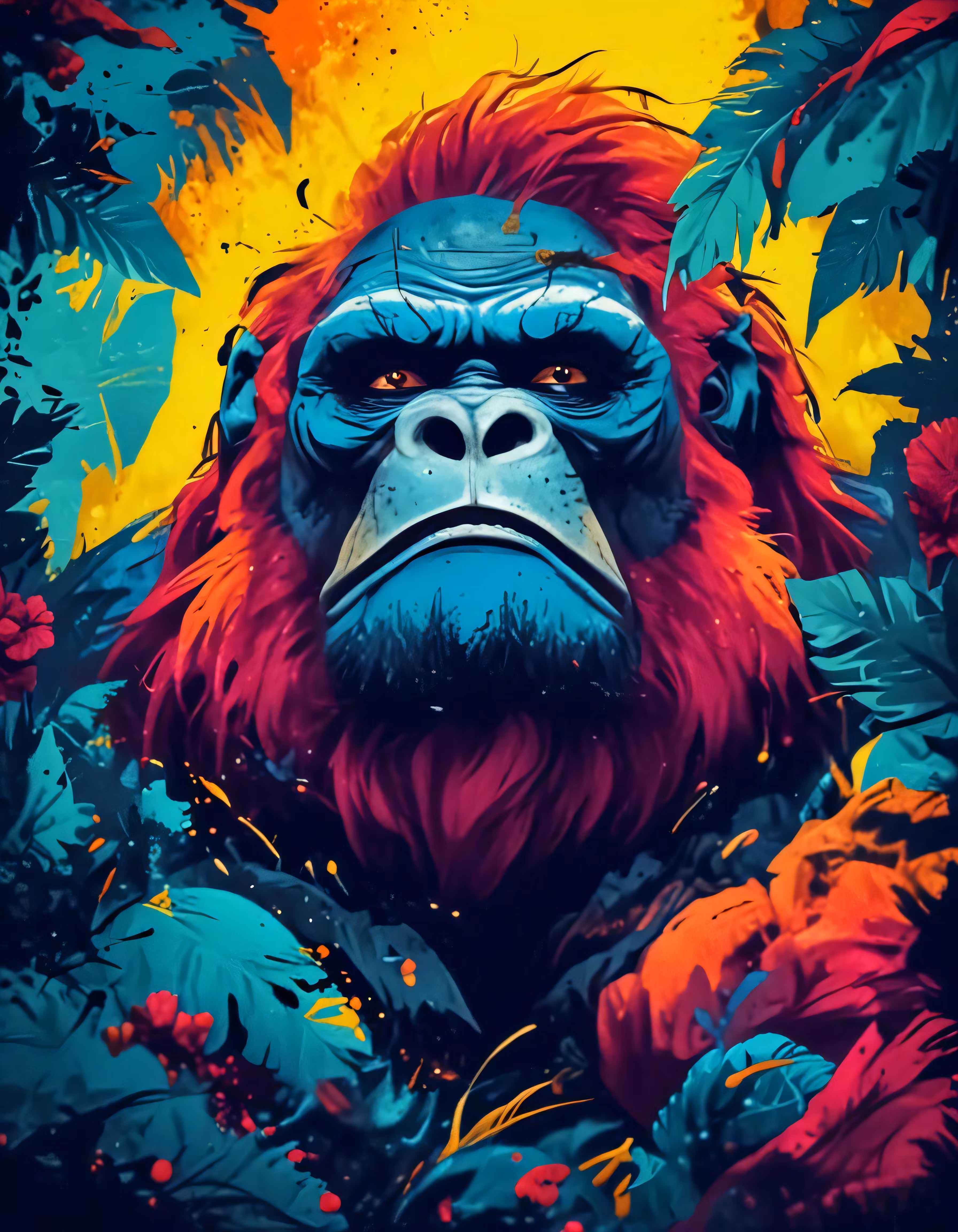 High resolution picture, free to use, a painting of a gorilla face with leaves around it