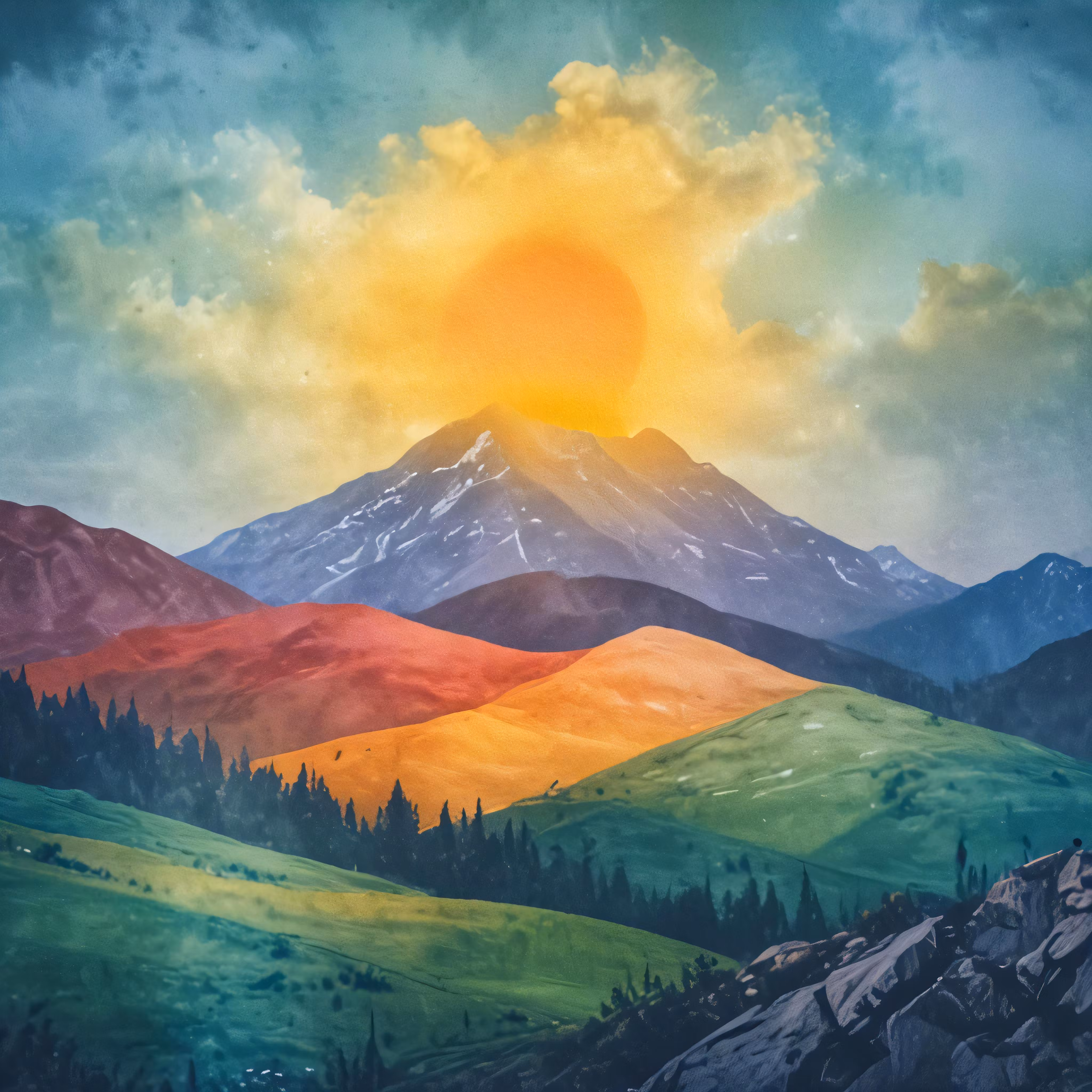 High resolution picture, free to use, a painting of a landscape with trees on top of the hill
