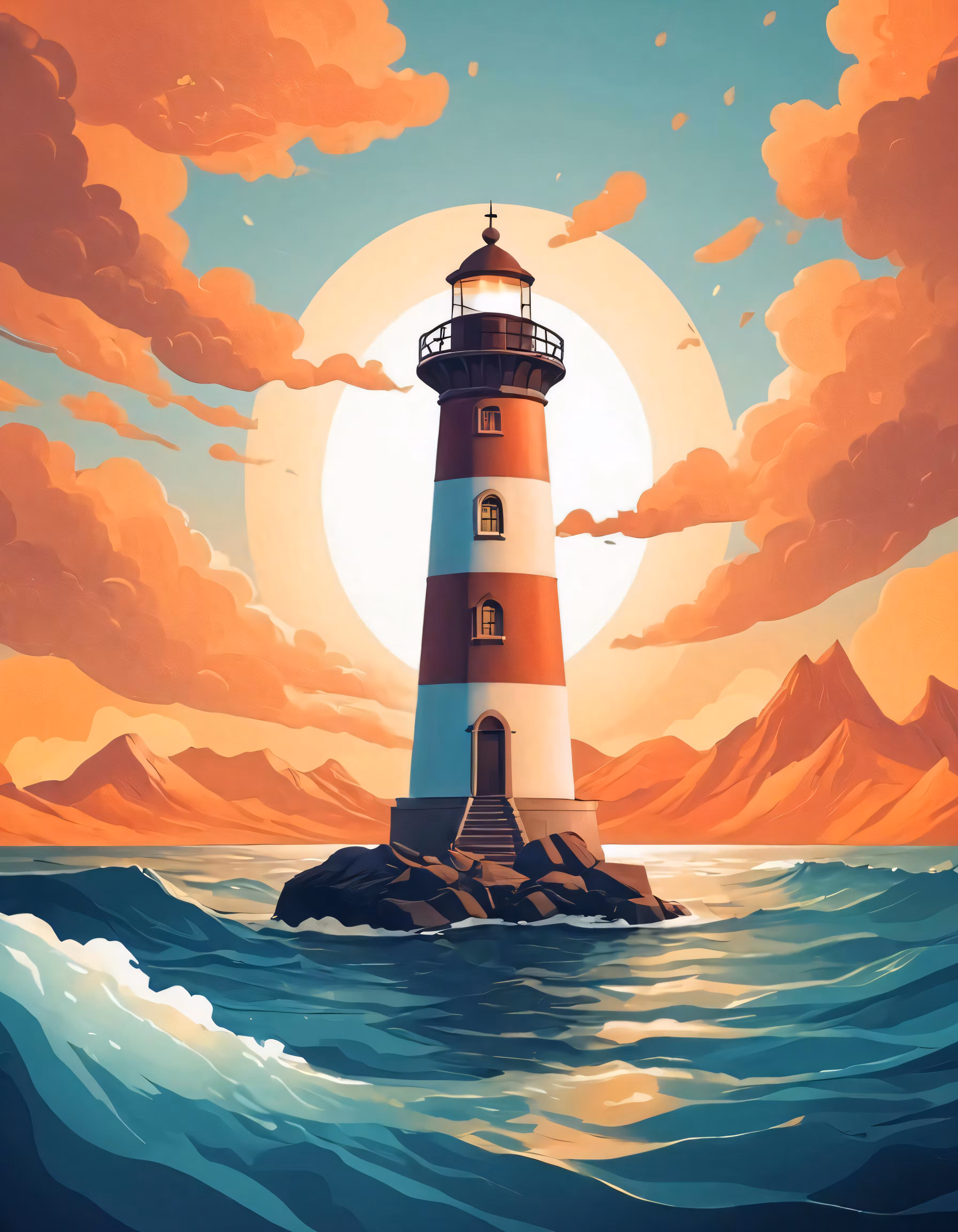 High resolution picture, free to use, a painting of a lighthouse at the top of a hill