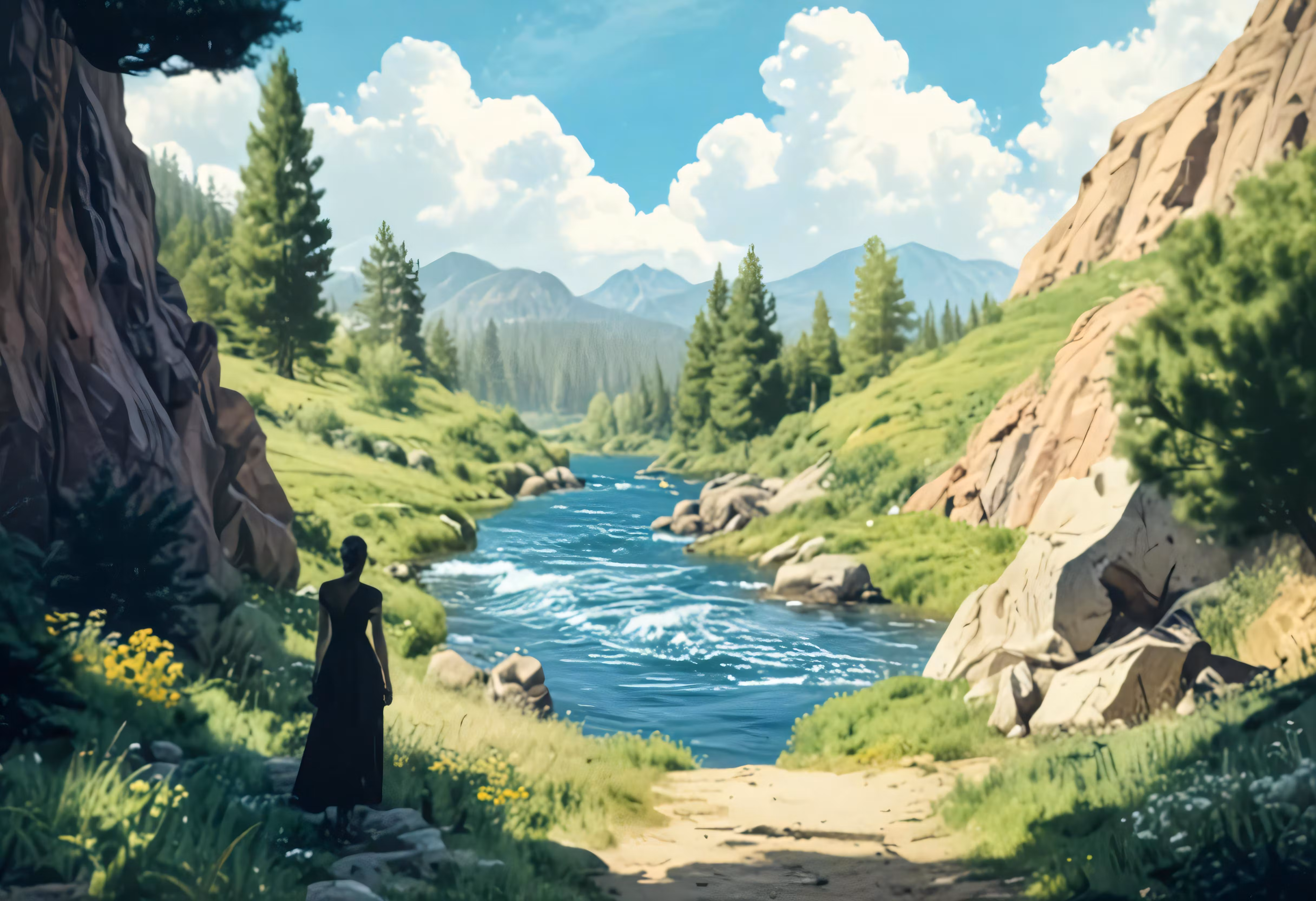 High resolution picture, free to use, a painting of a person in a large wooded area near the water