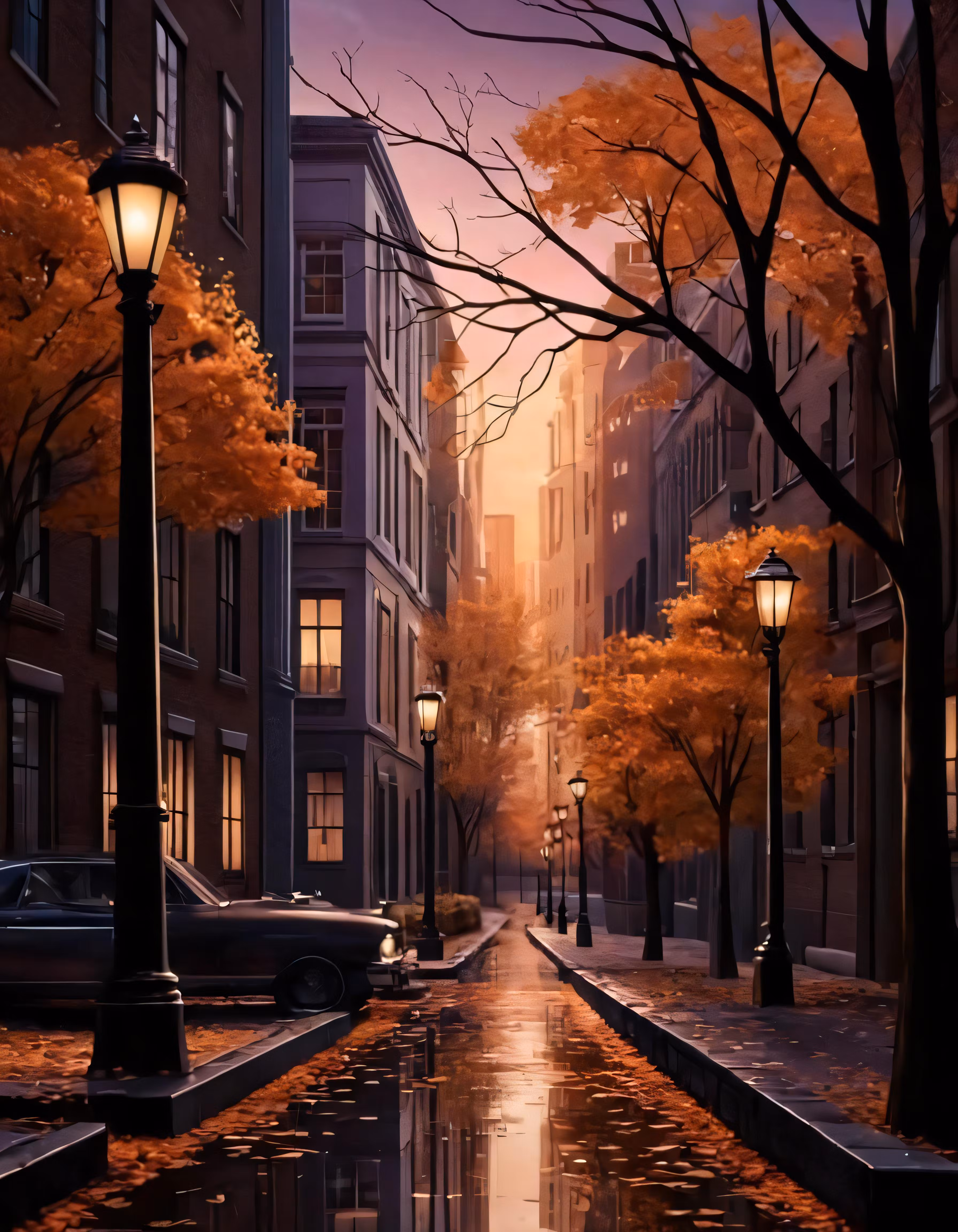 High resolution picture, free to use, a painting of a quiet city street filled with trees