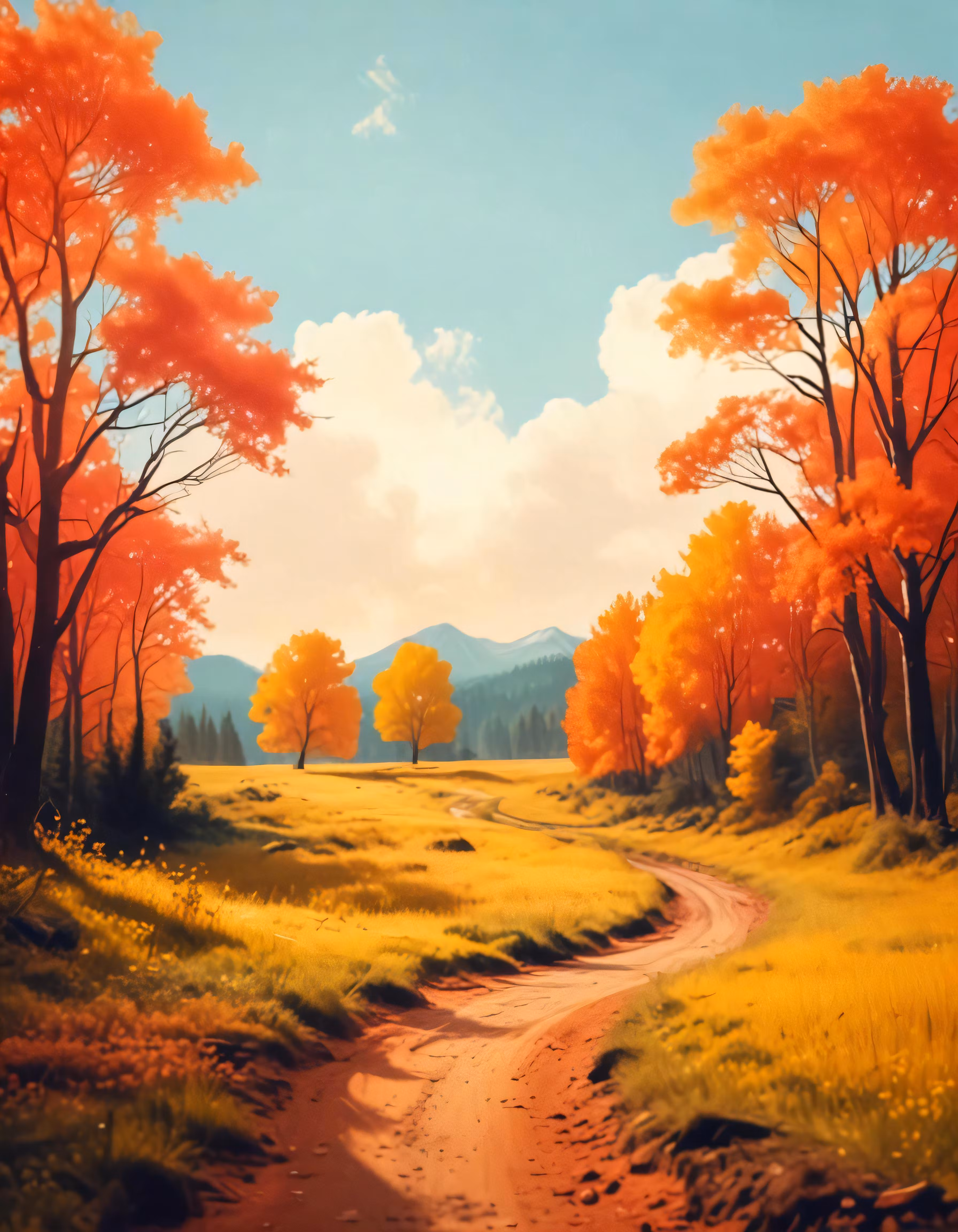 High resolution picture, free to use, a painting of a road with red trees and green grass on the side