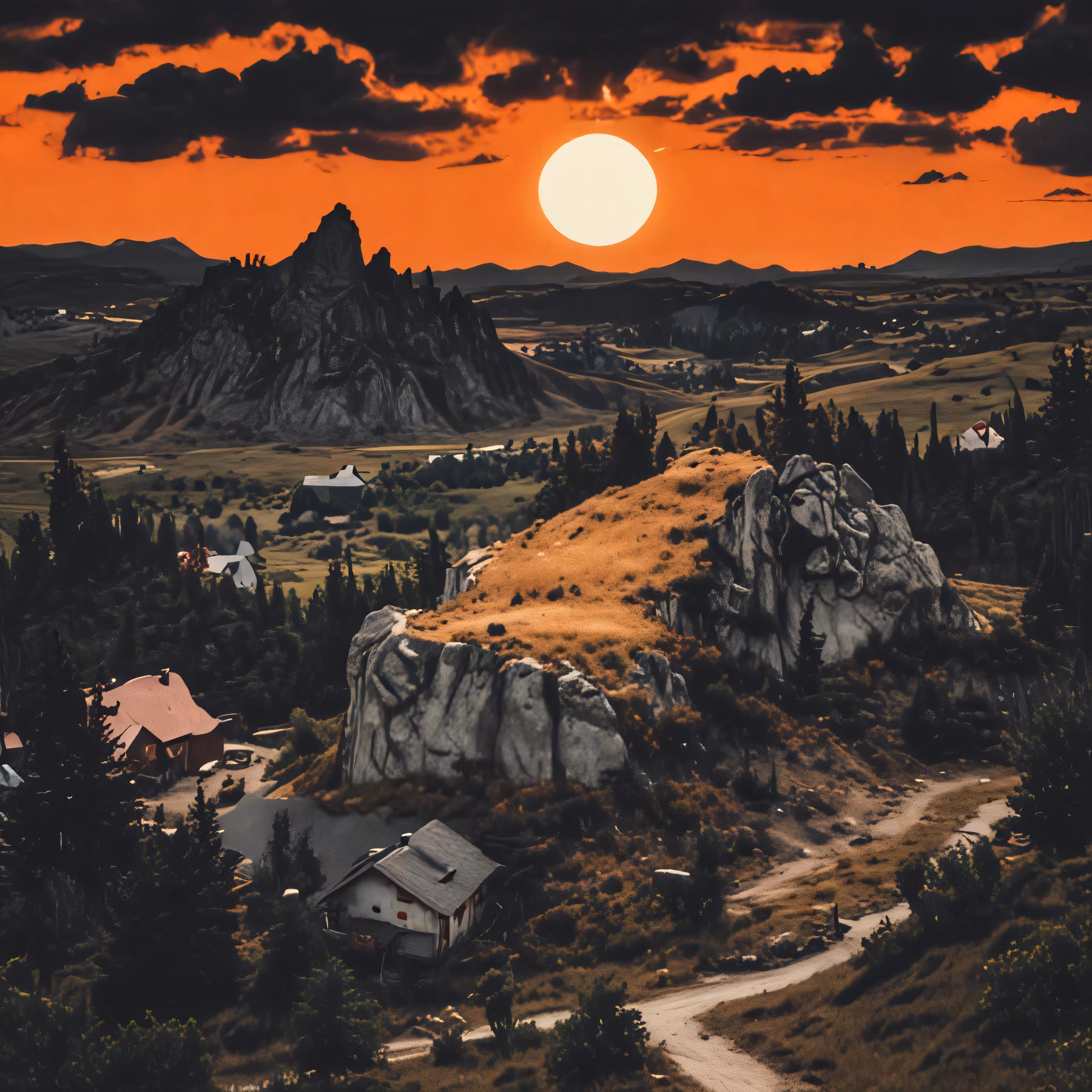 High resolution picture, free to use, a painting of a rocky mountain village and a red sun over mountains