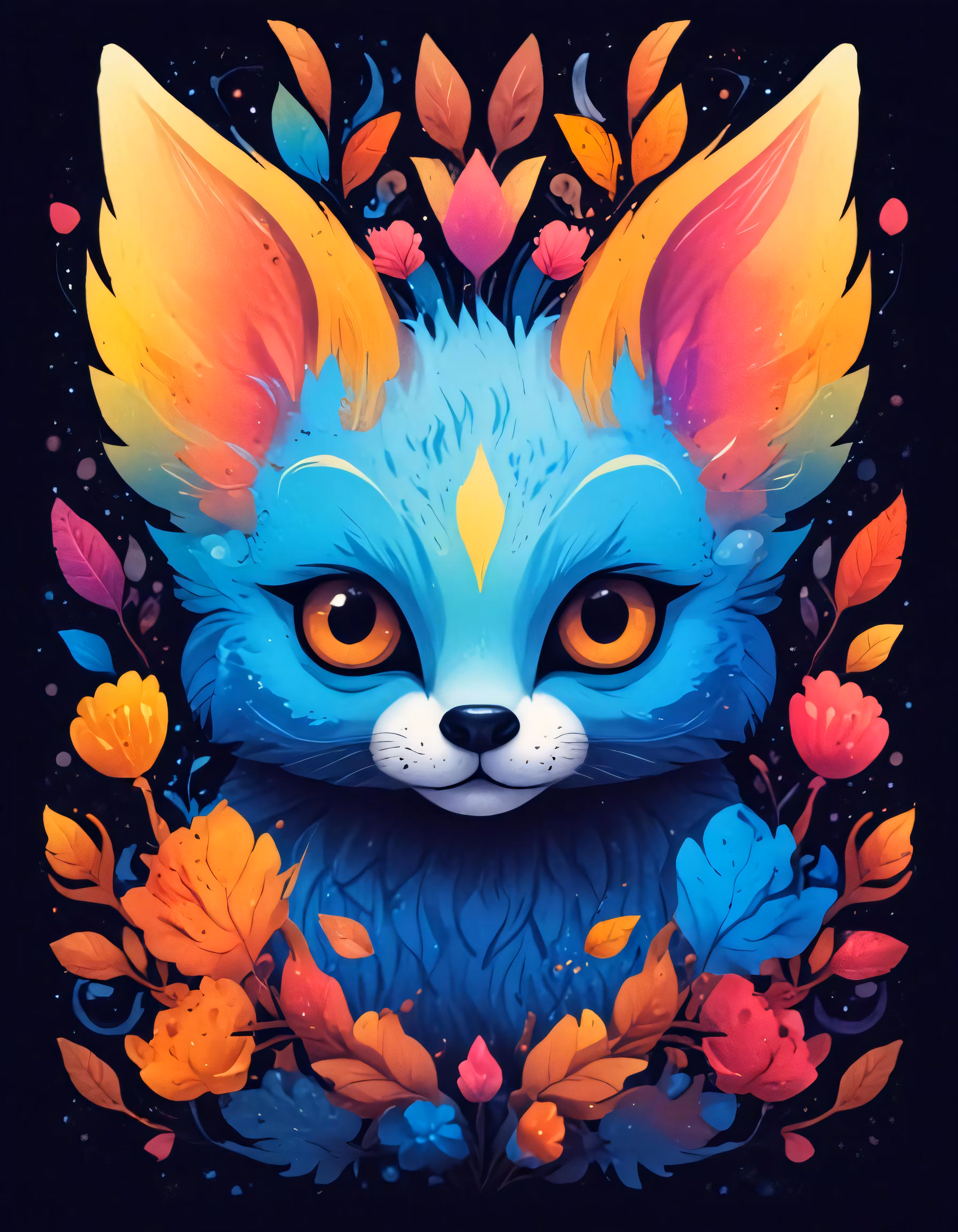 High resolution picture, free to use, a painting of a small, cute animal with flowers around its head
