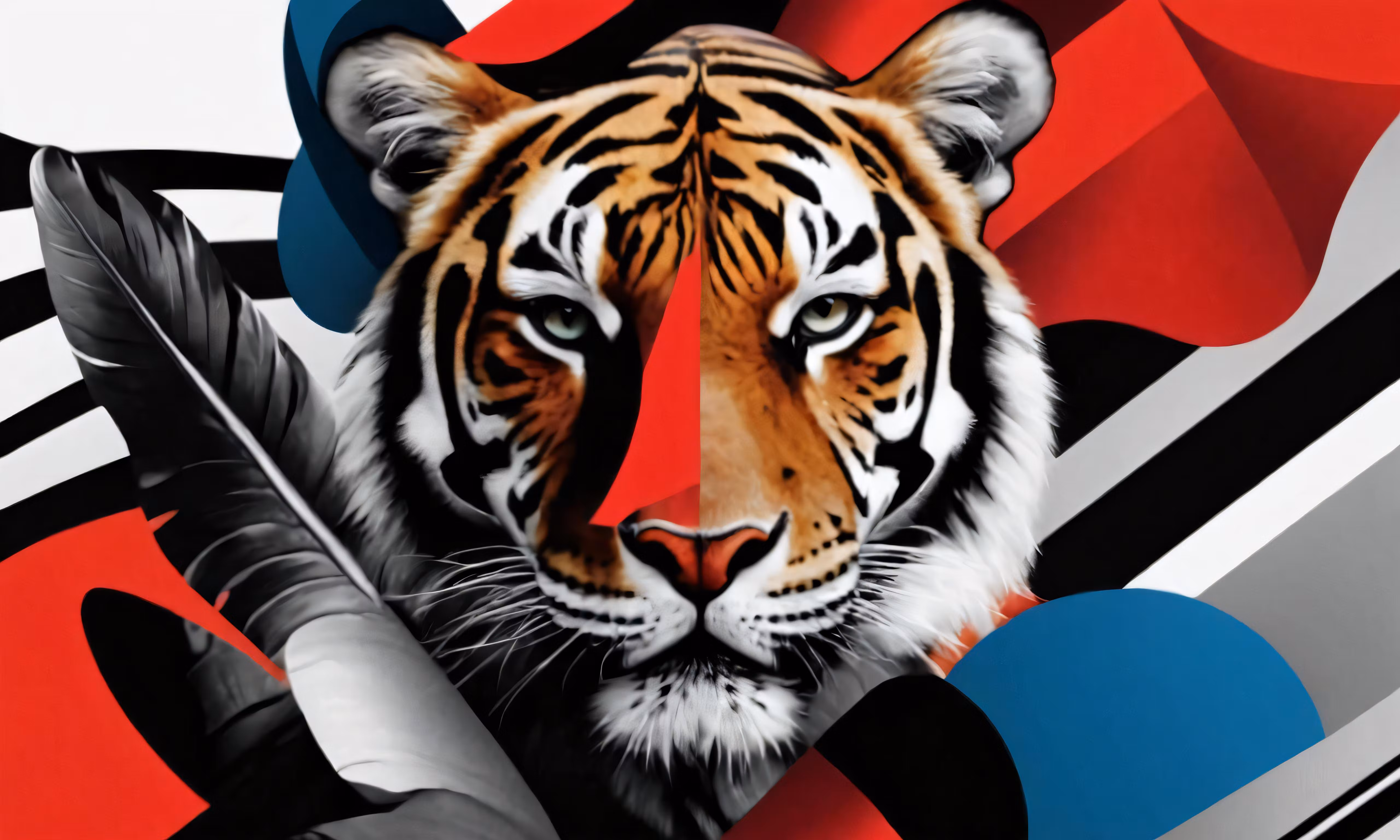 High resolution picture, free to use, a painting of a tiger with feathers and geometric shapes