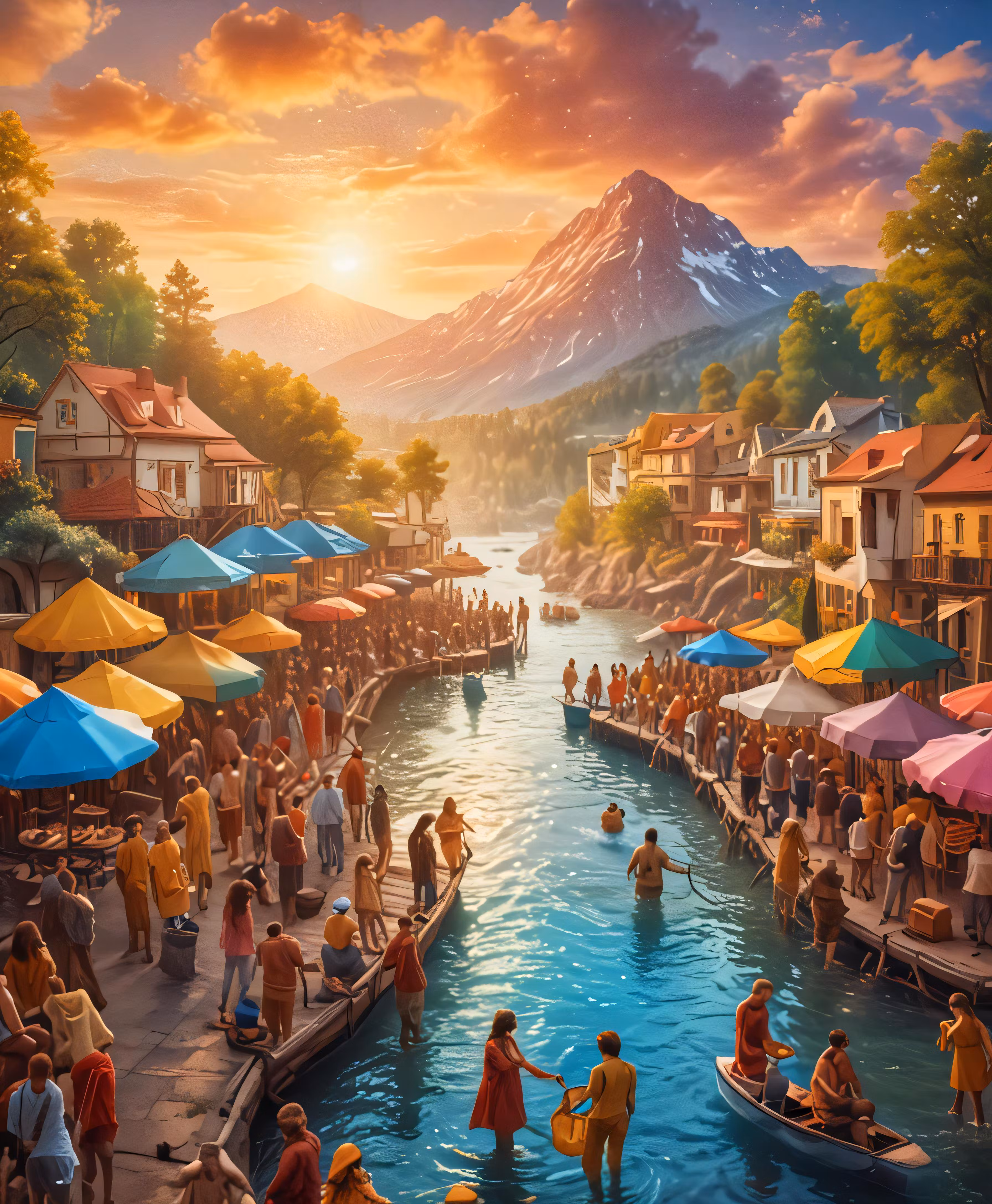 High resolution picture, free to use, a painting of a village where people are enjoying some boating