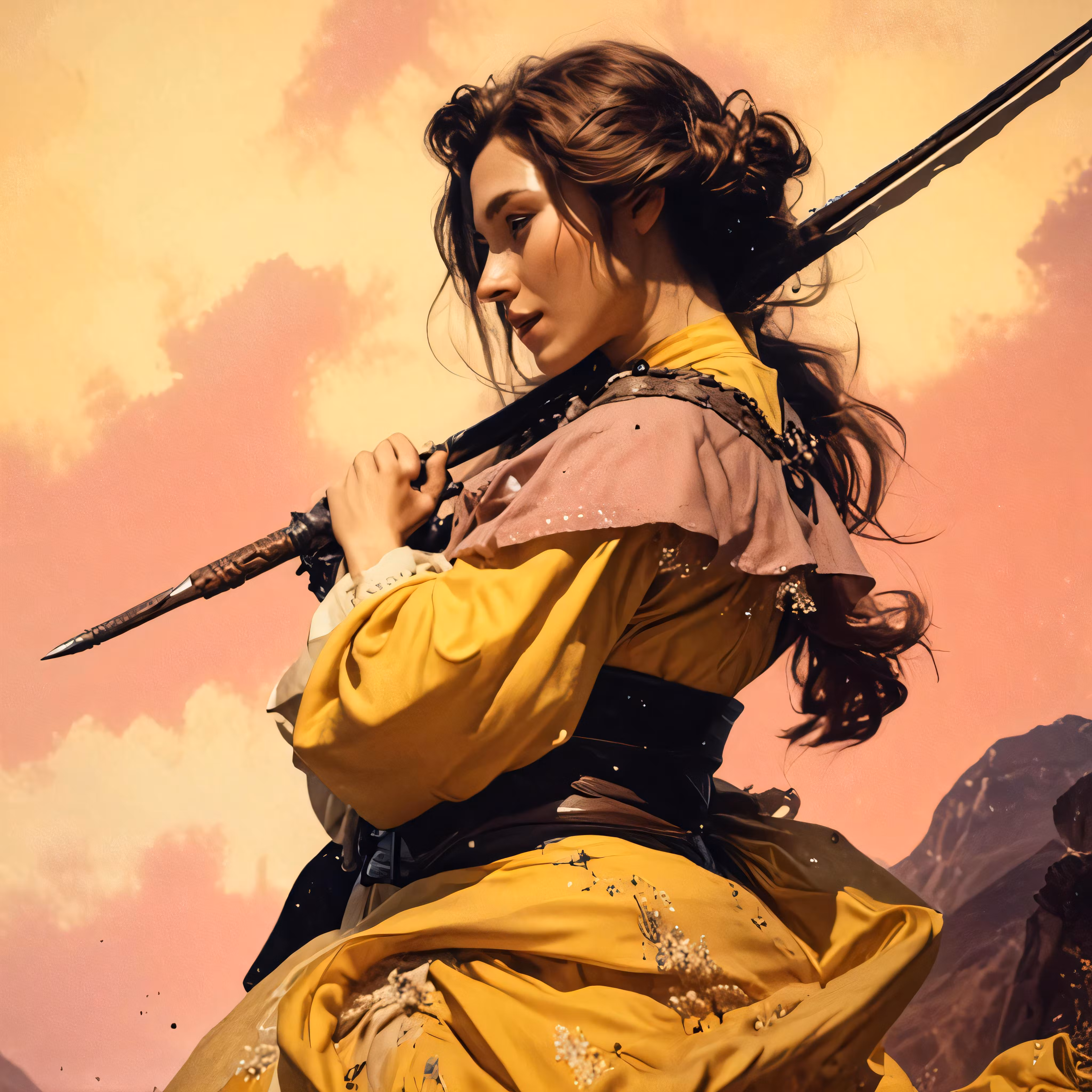 High resolution picture, free to use, a painting of a woman holding two swords