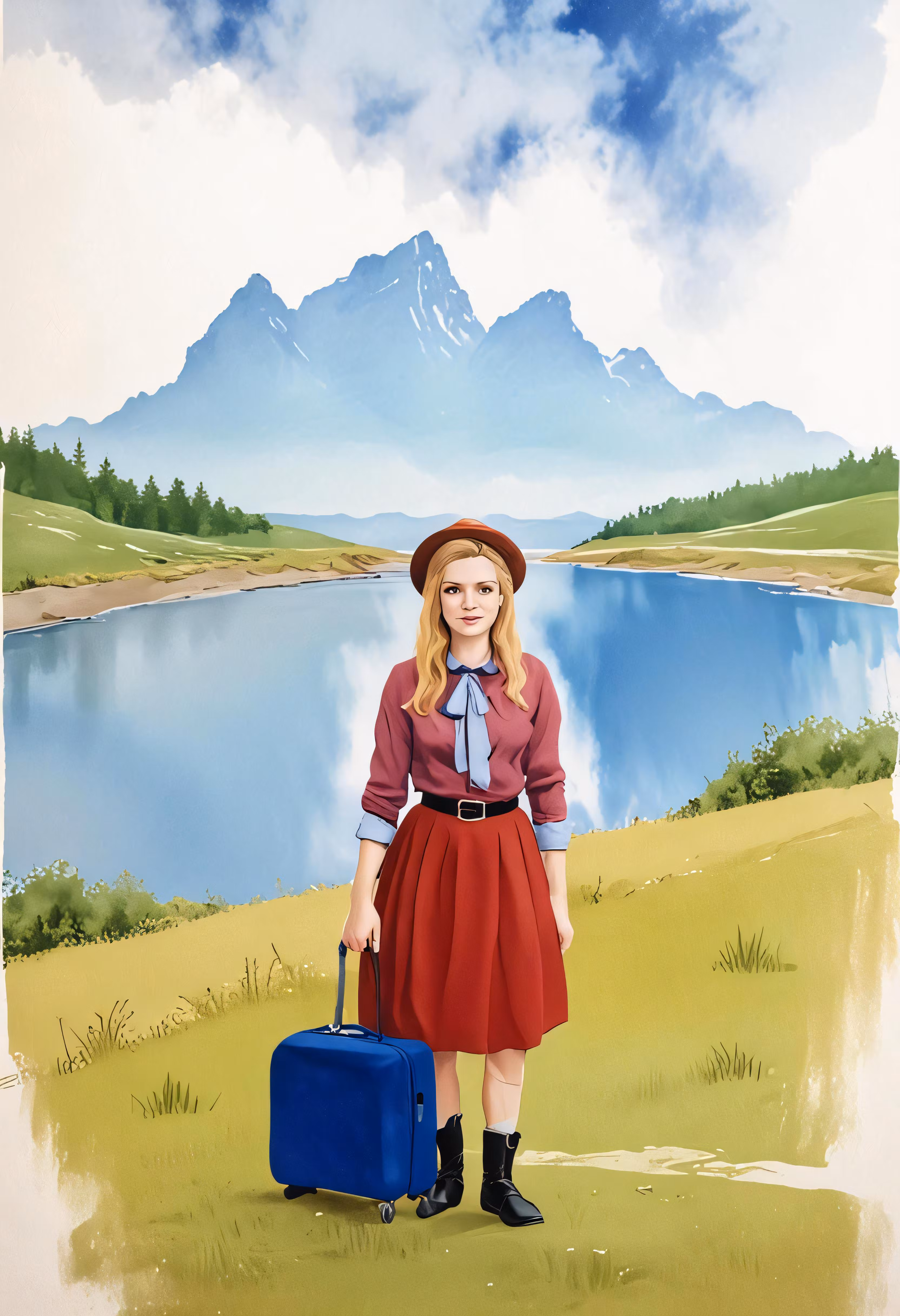 High resolution picture, free to use, a painting of a woman in a dress and hat is standing with a blue suitcase by a lake