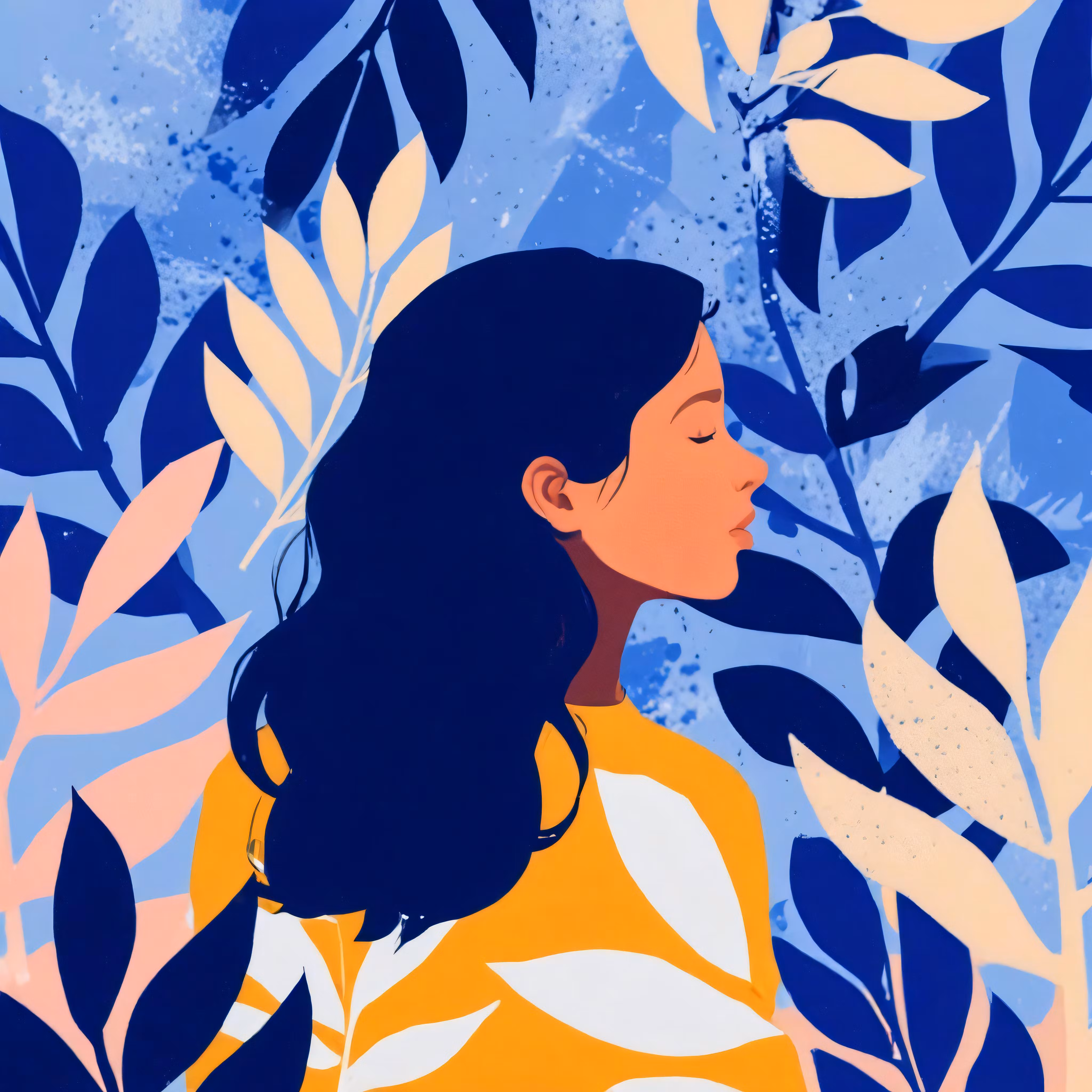 High resolution picture, free to use, a painting of a woman in front of some leaves