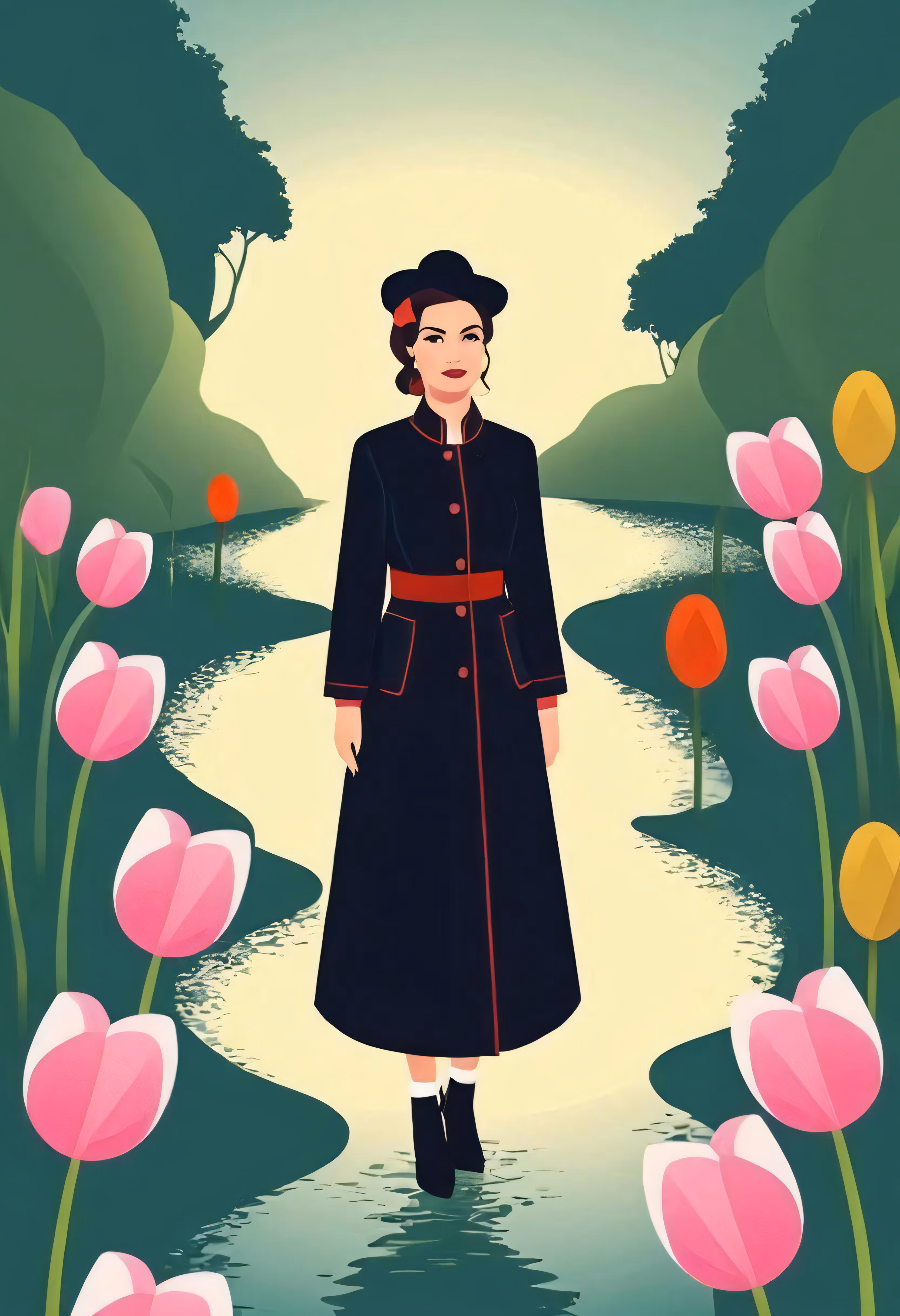 High resolution picture, free to use, a painting of a woman standing in front of a floral garden
