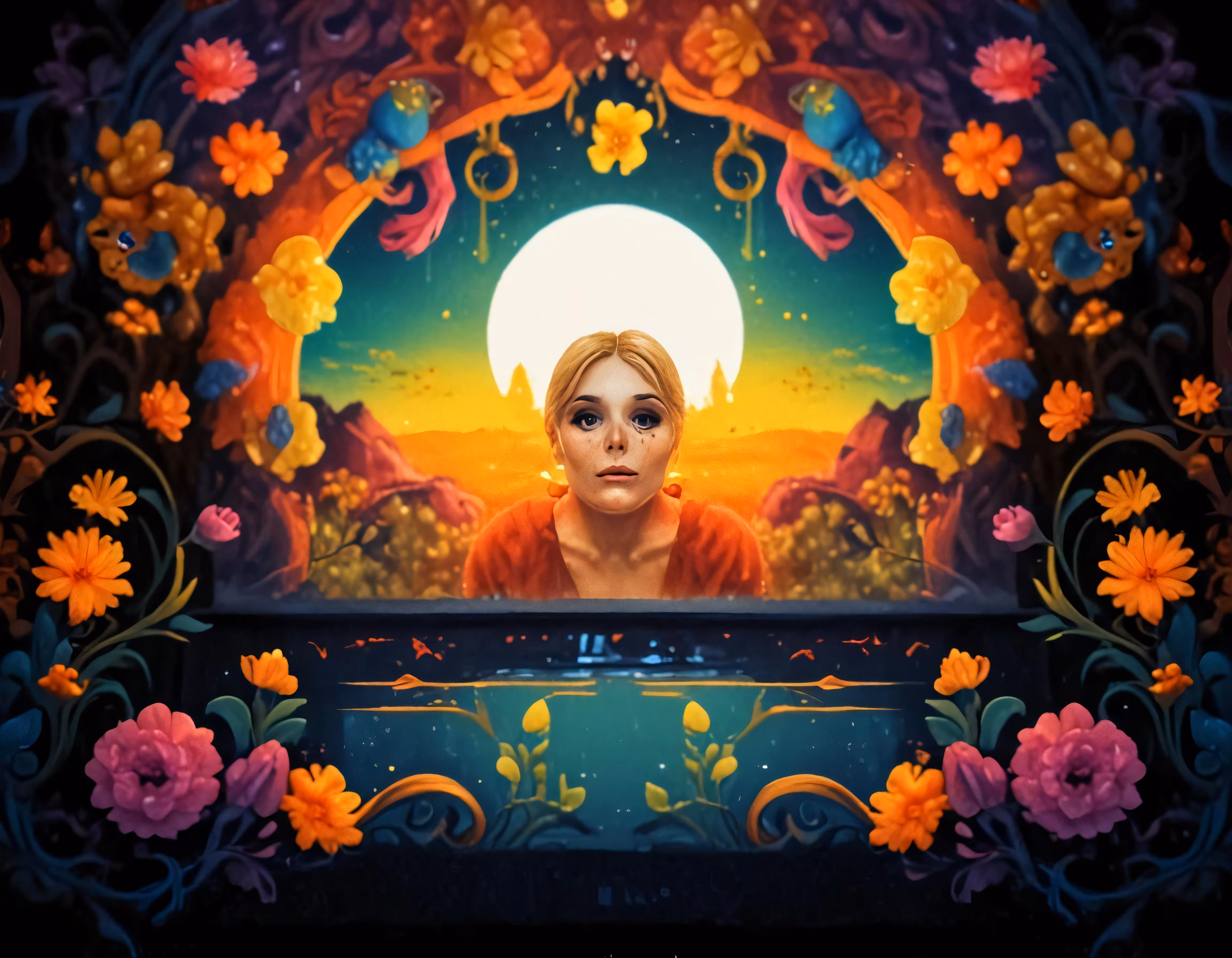 High resolution picture, free to use, a painting of a woman with a very large frecky eye in a dark room