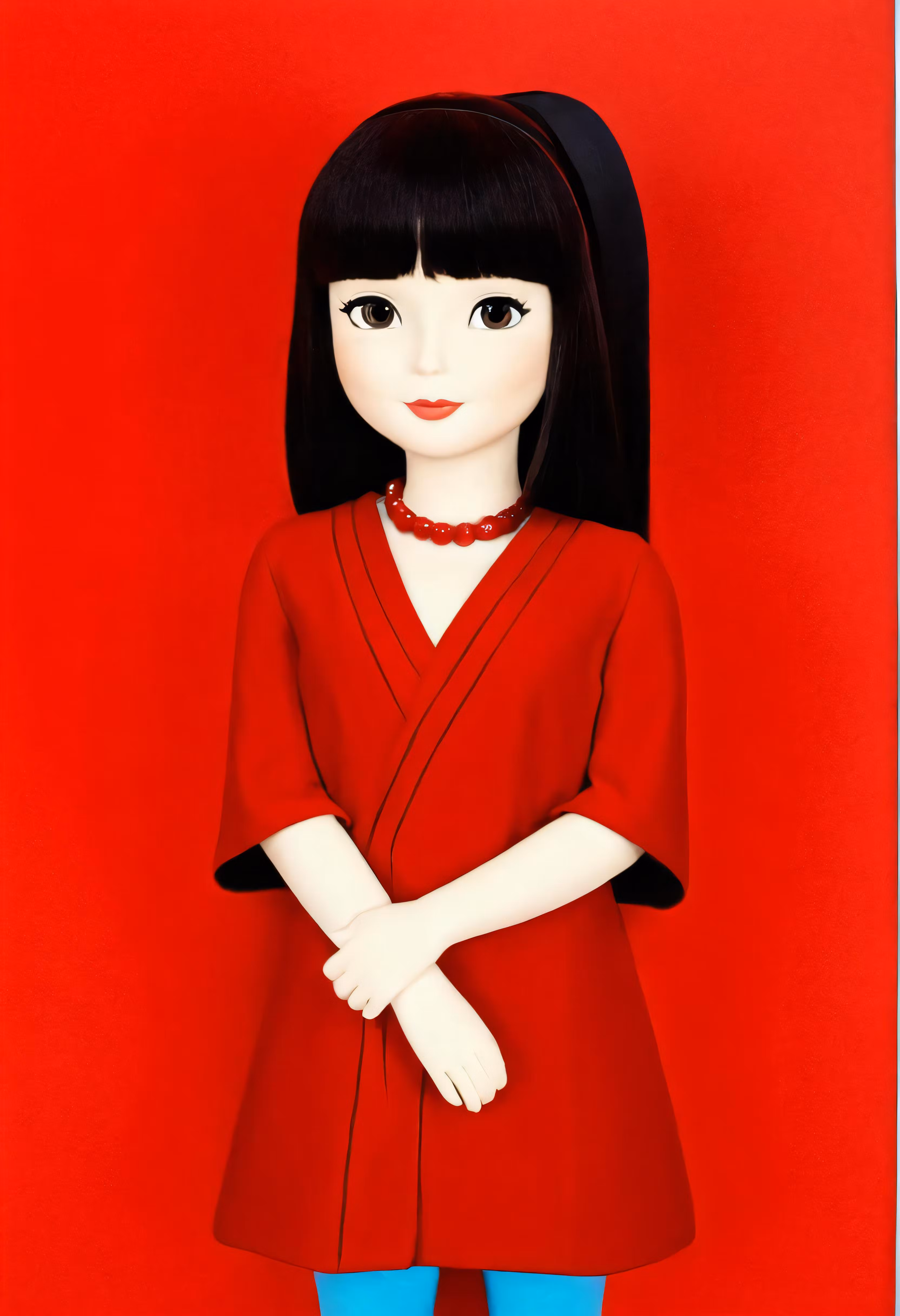 High resolution picture, free to use, a painting of a woman with black hair and blue pants