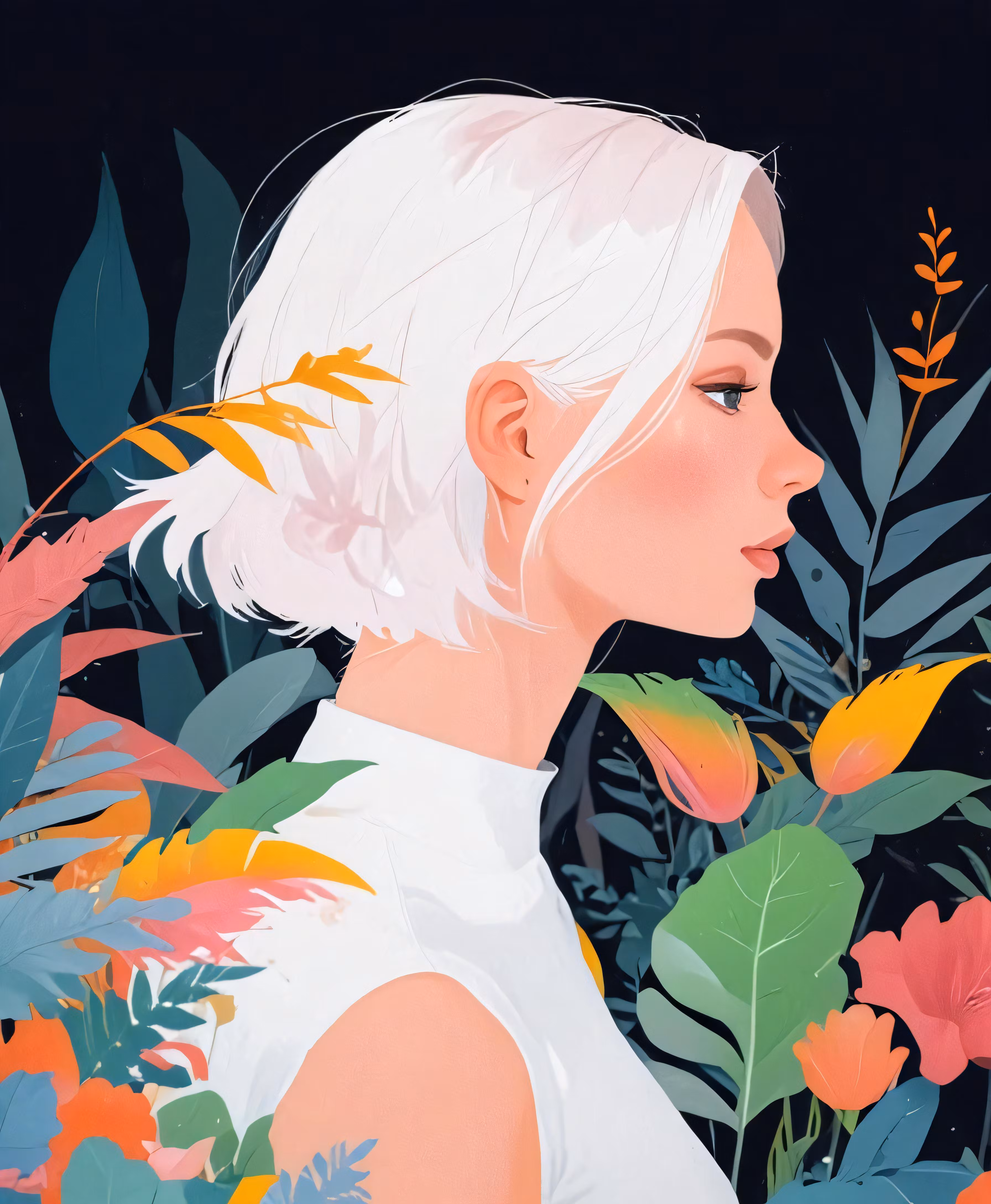 High resolution picture, free to use, a painting of a woman with white hair with pink and yellow flowers in her hair