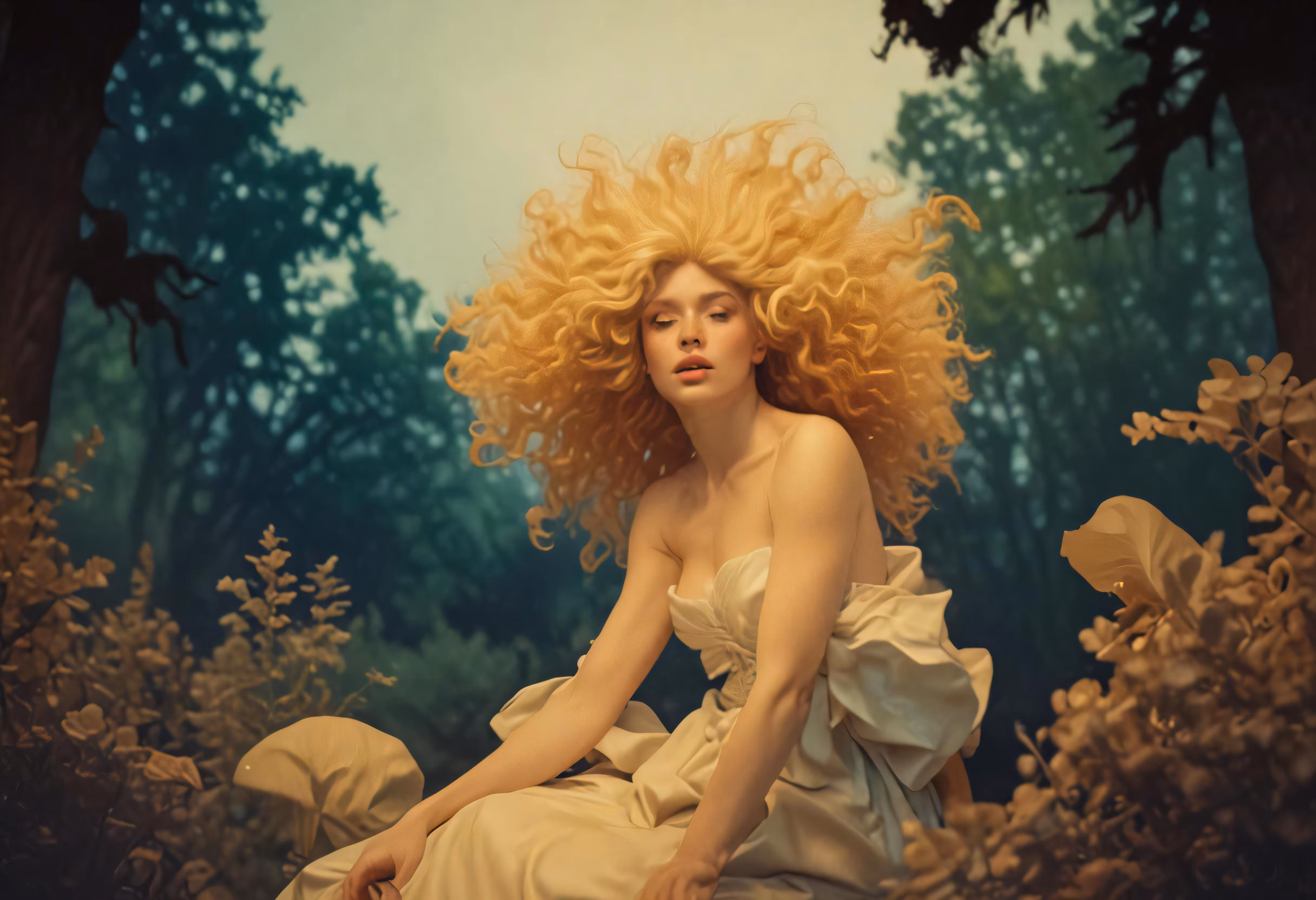 High resolution picture, free to use, a painting of a young woman with long blonde hair sitting on the ground