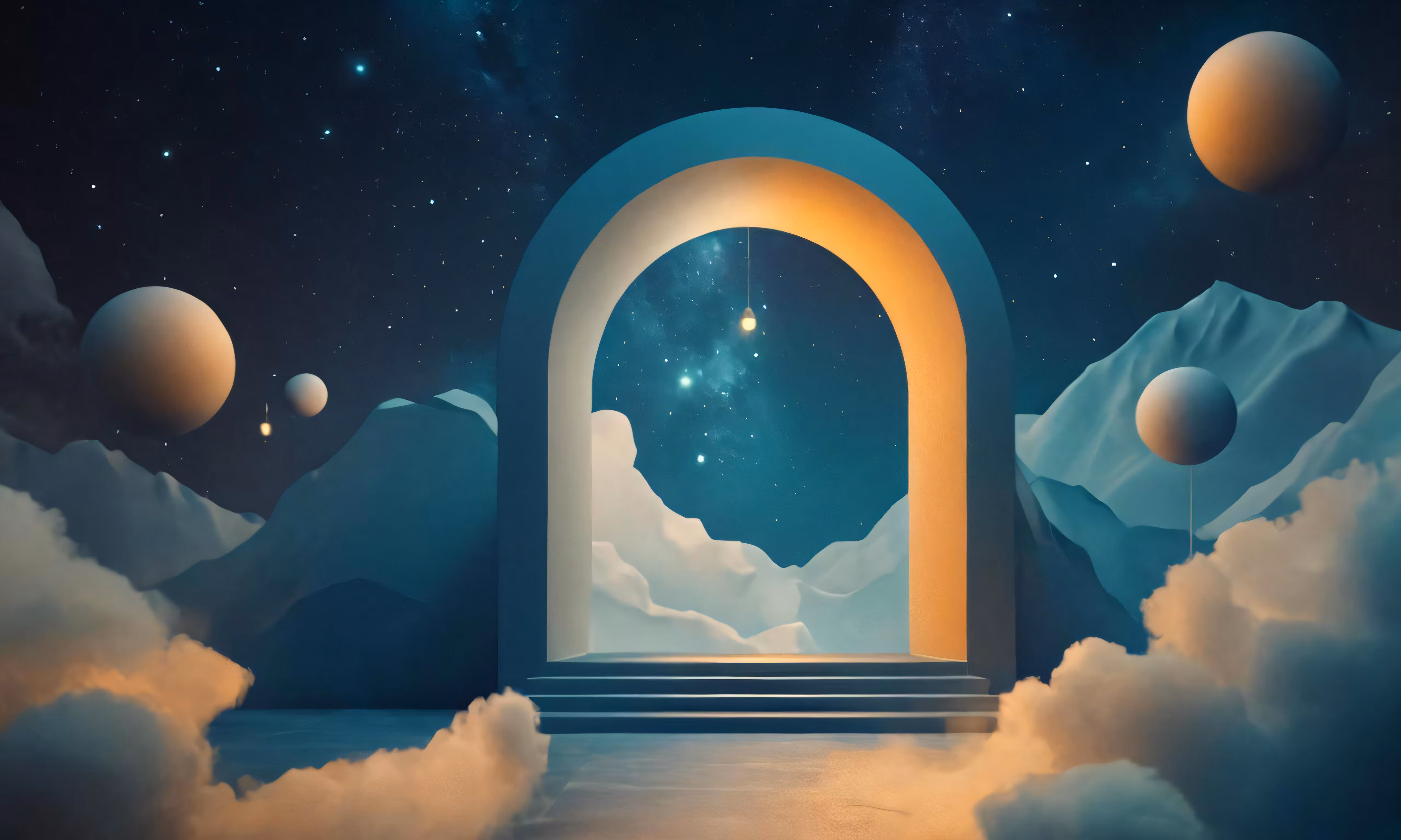 High resolution picture, free to use, a painting of an arch in the clouds with several planets on the sky