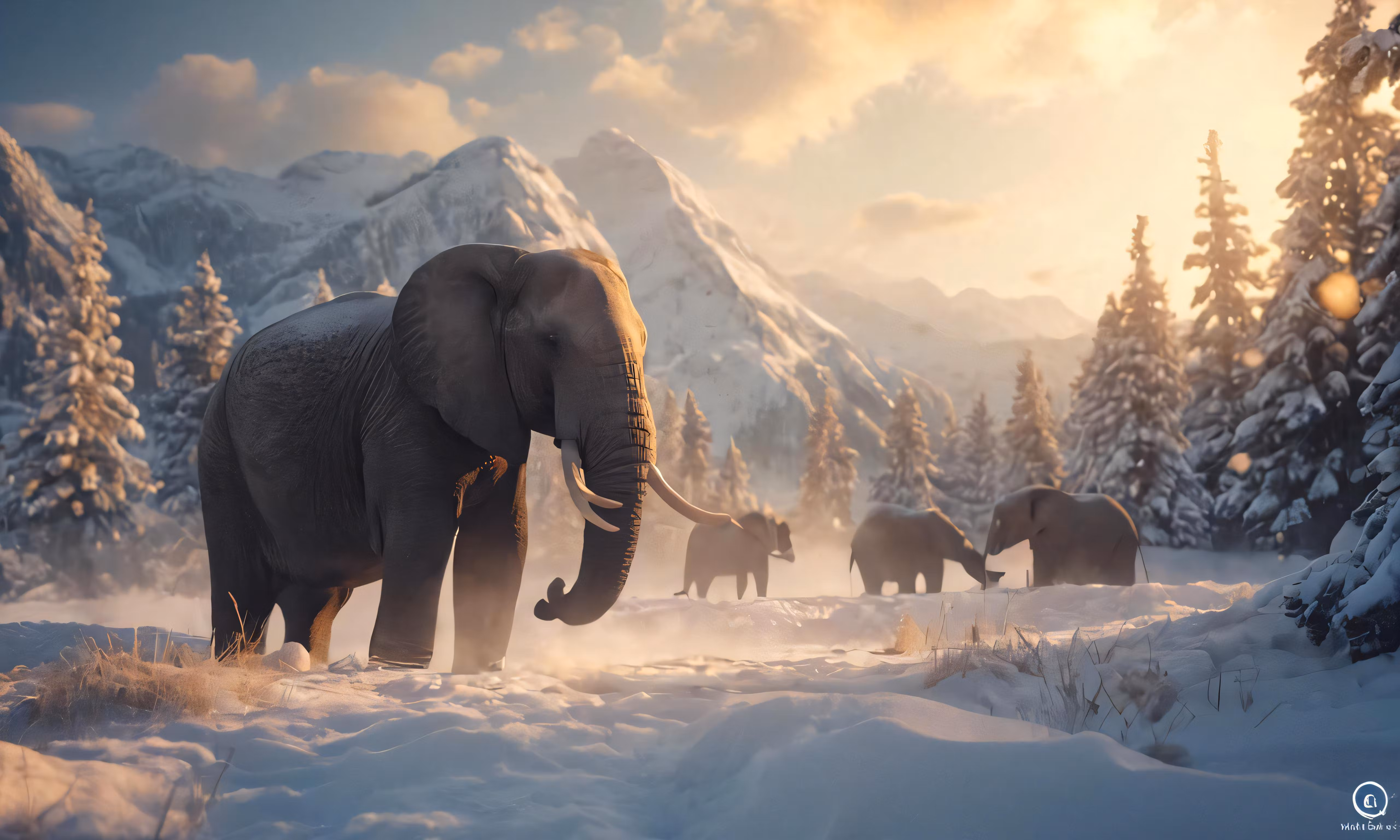 High resolution picture, free to use, a painting of an elephant and other animals on a snowy field