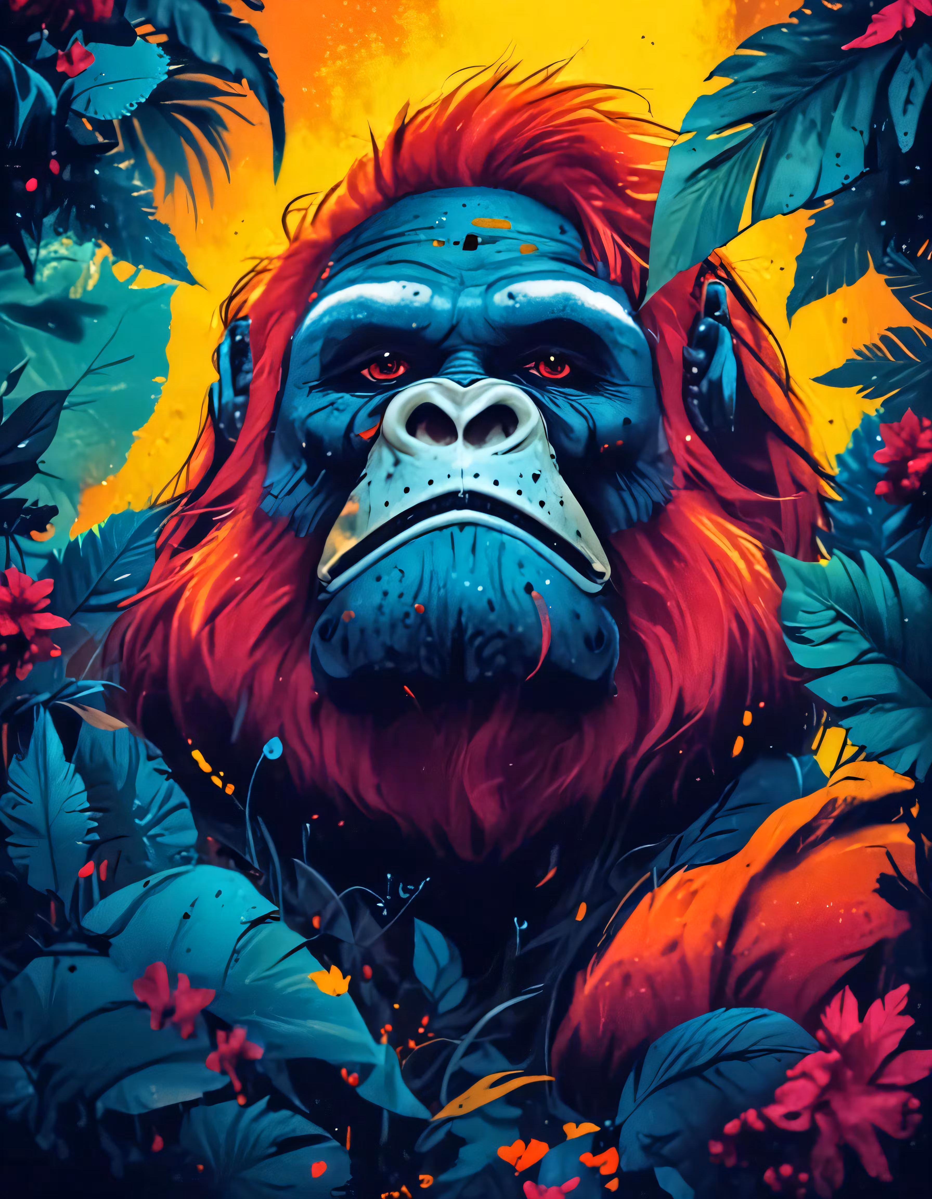 High resolution picture, free to use, a painting of an evil looking gorilla on the forest