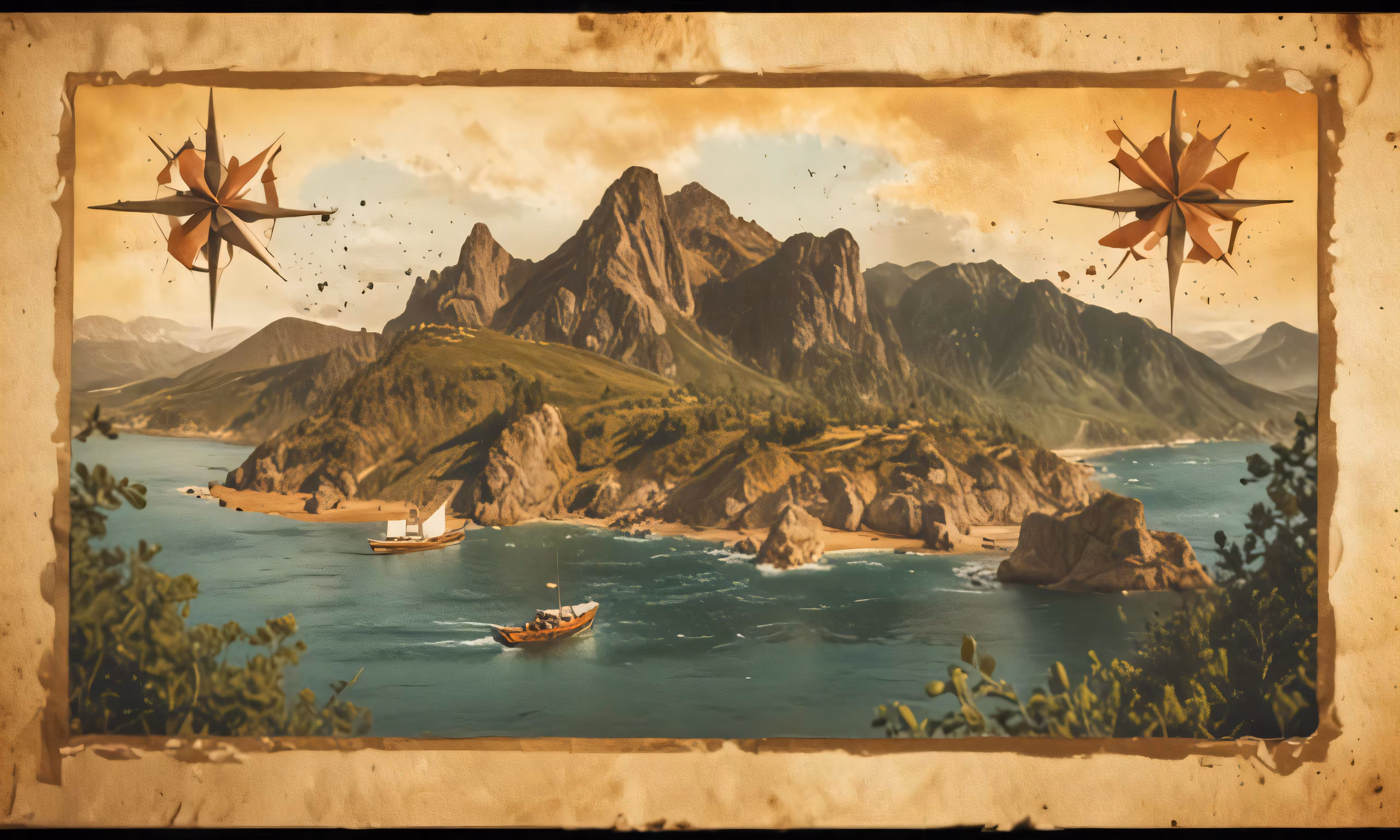 High resolution picture, free to use, a painting of an old looking mountain lake and island
