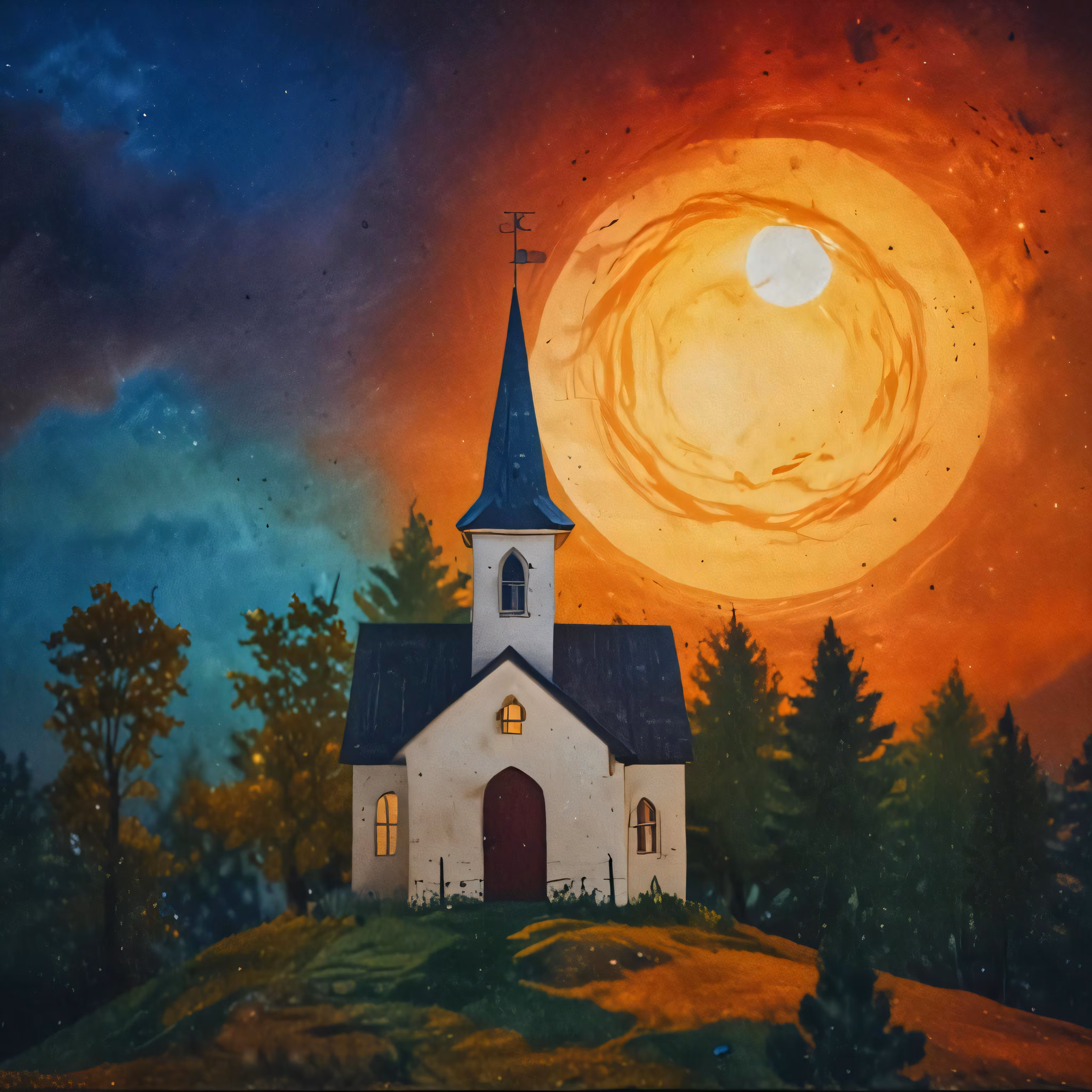 High resolution picture, free to use, a painting of an old white church in front of a bright full moon