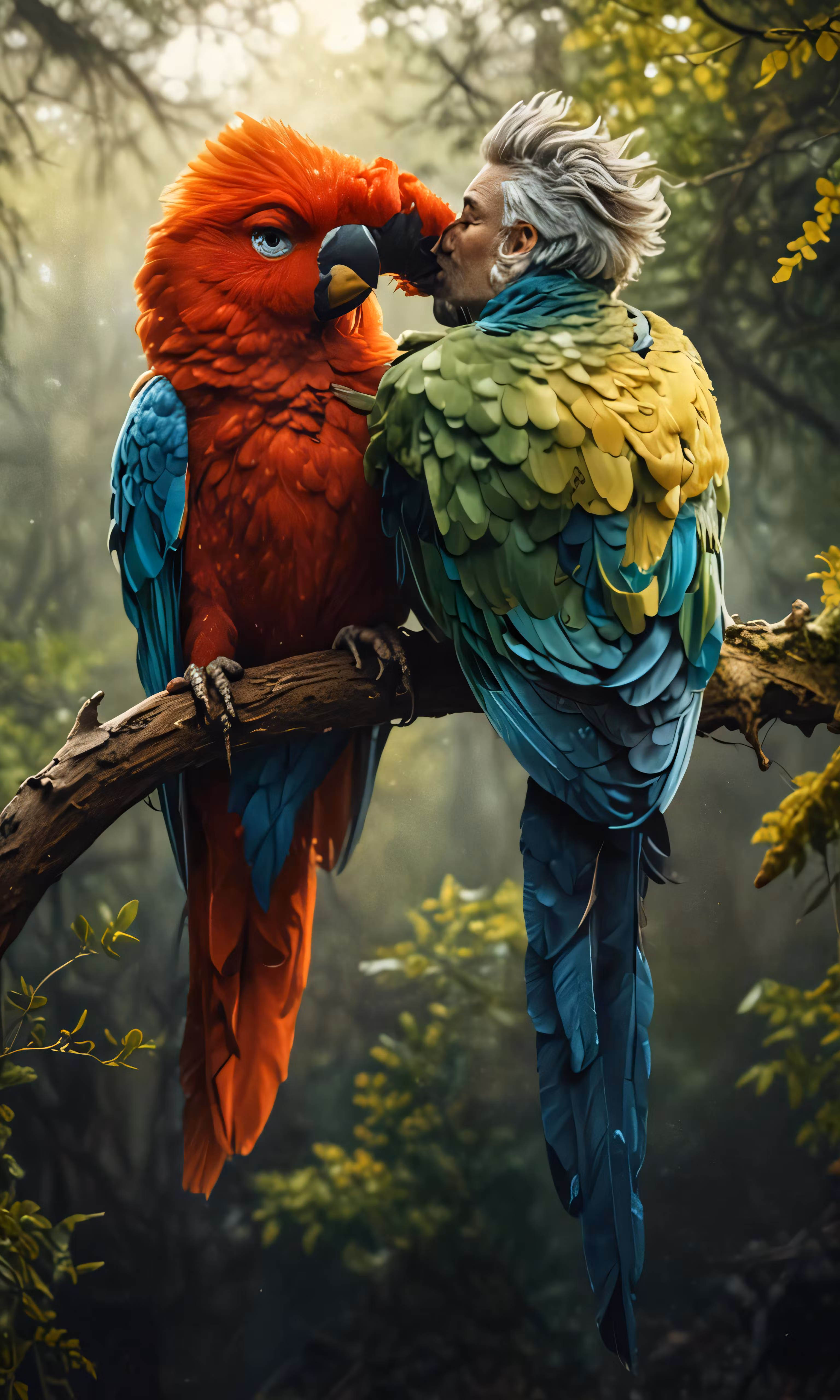 High resolution picture, free to use, a painting of an orange and blue parrot sitting next to a green parrot