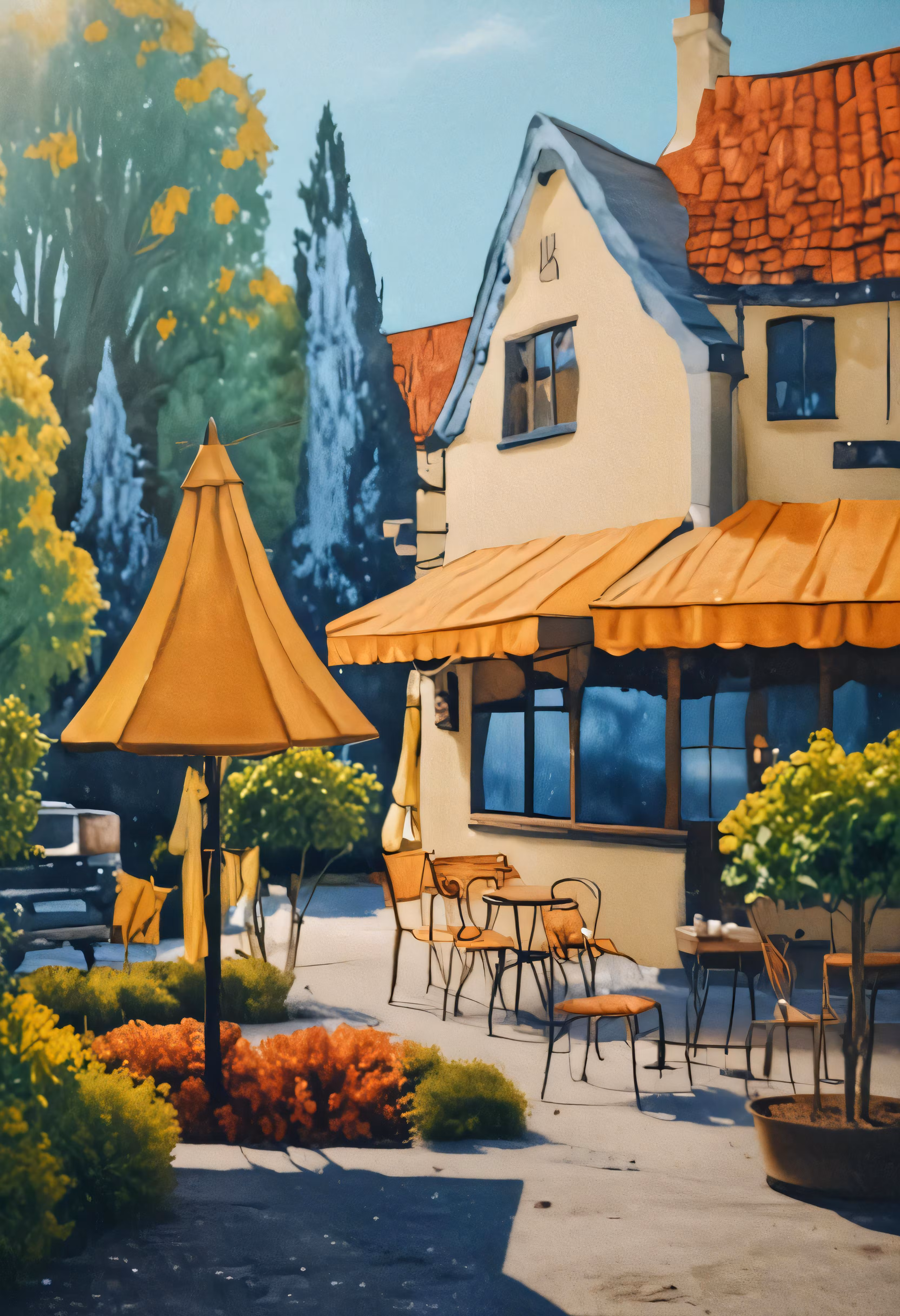 High resolution picture, free to use, a painting of an outdoor cafe with orange and white canopy