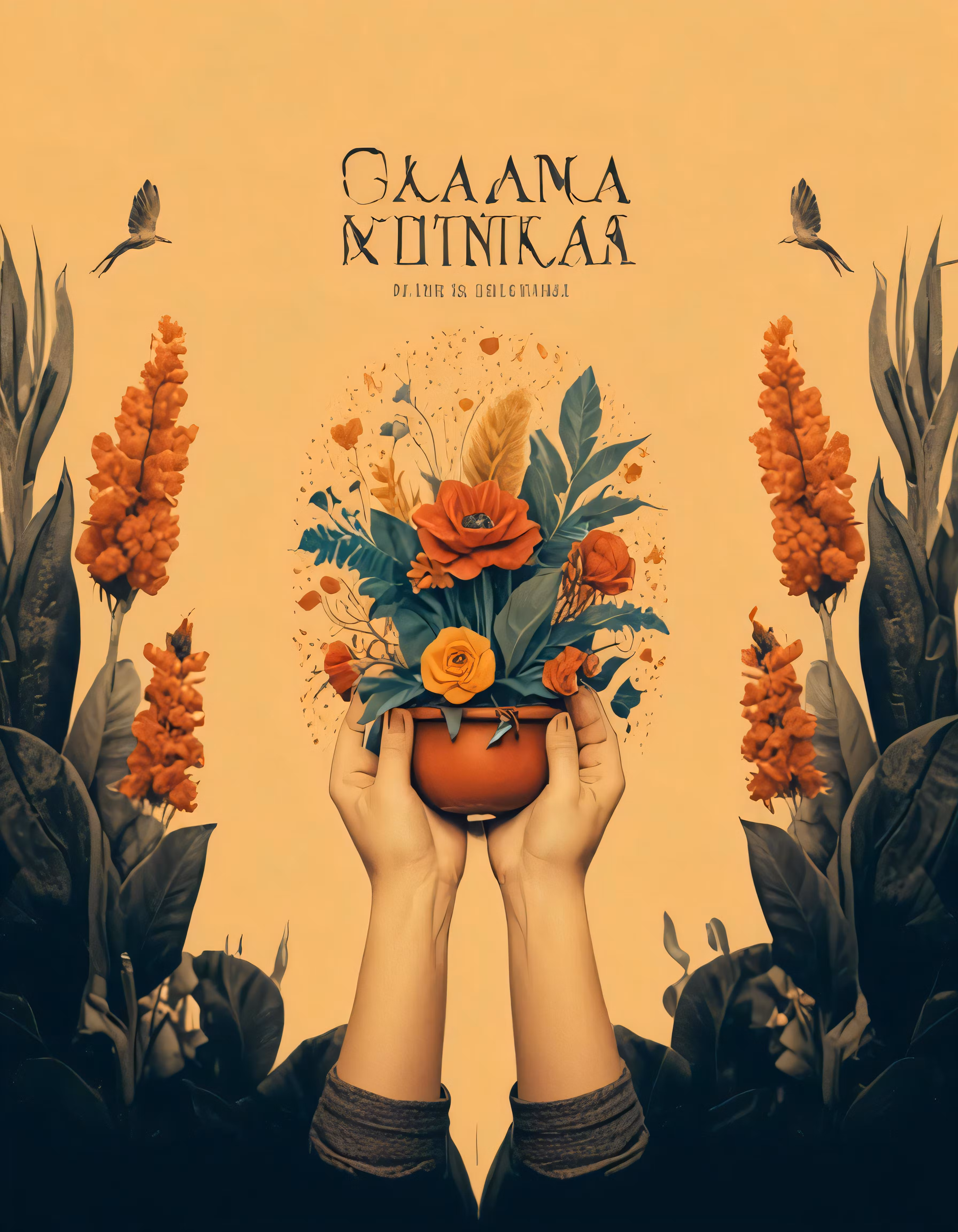 High resolution picture, free to use, a painting of hands holding a vase with flowers in it