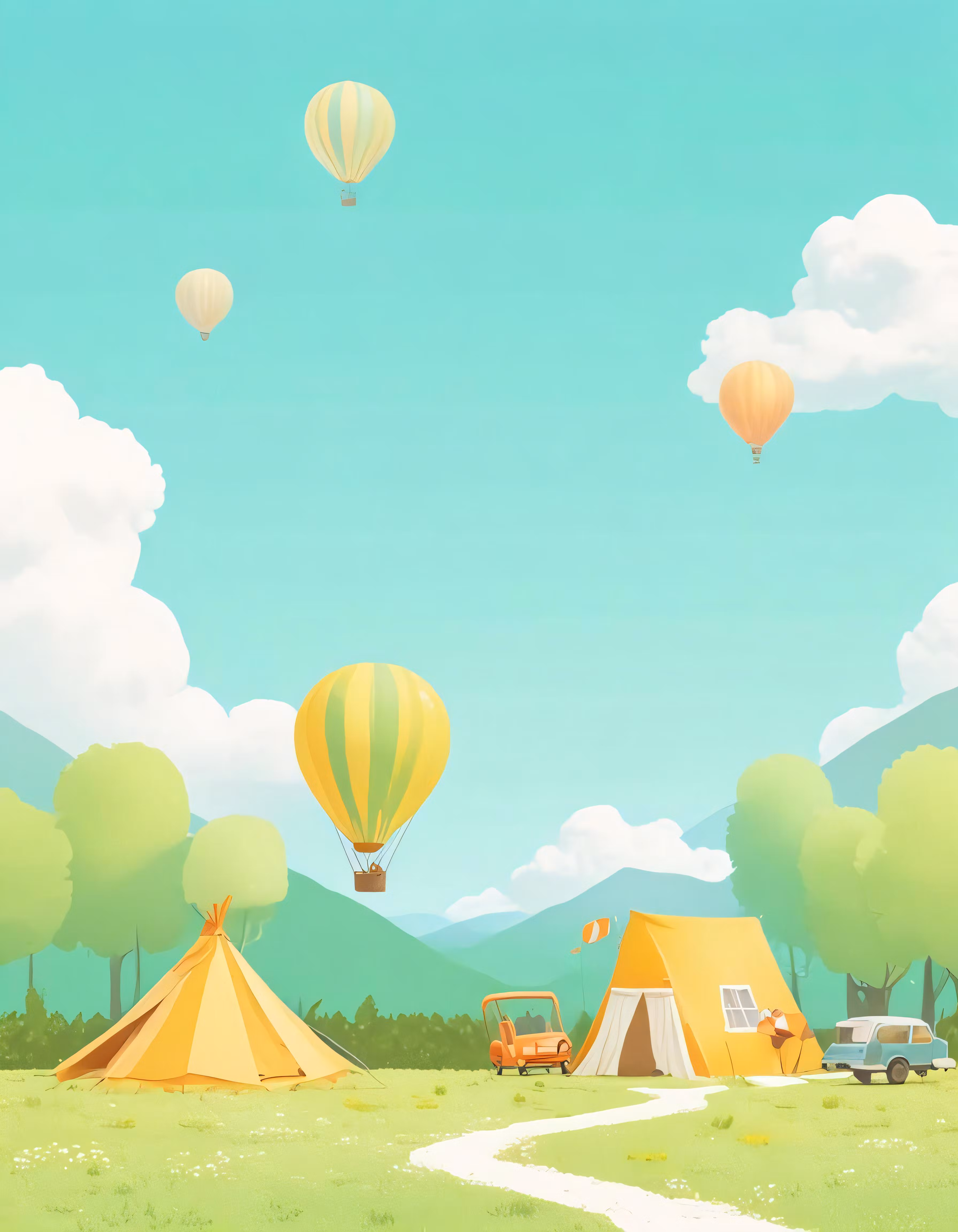 High resolution picture, free to use, a painting of hot air balloons flying over a grassy field