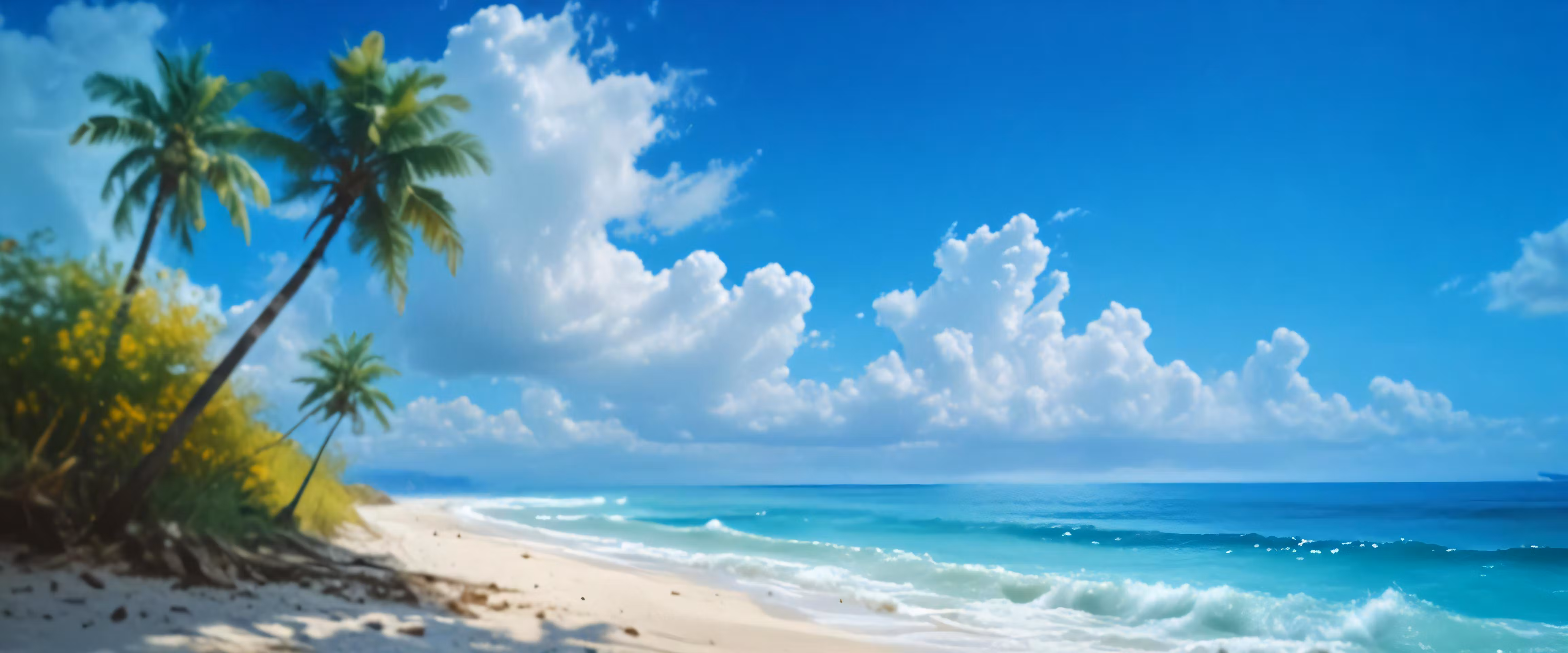 High resolution picture, free to use, a painting of some beach with trees and blue water