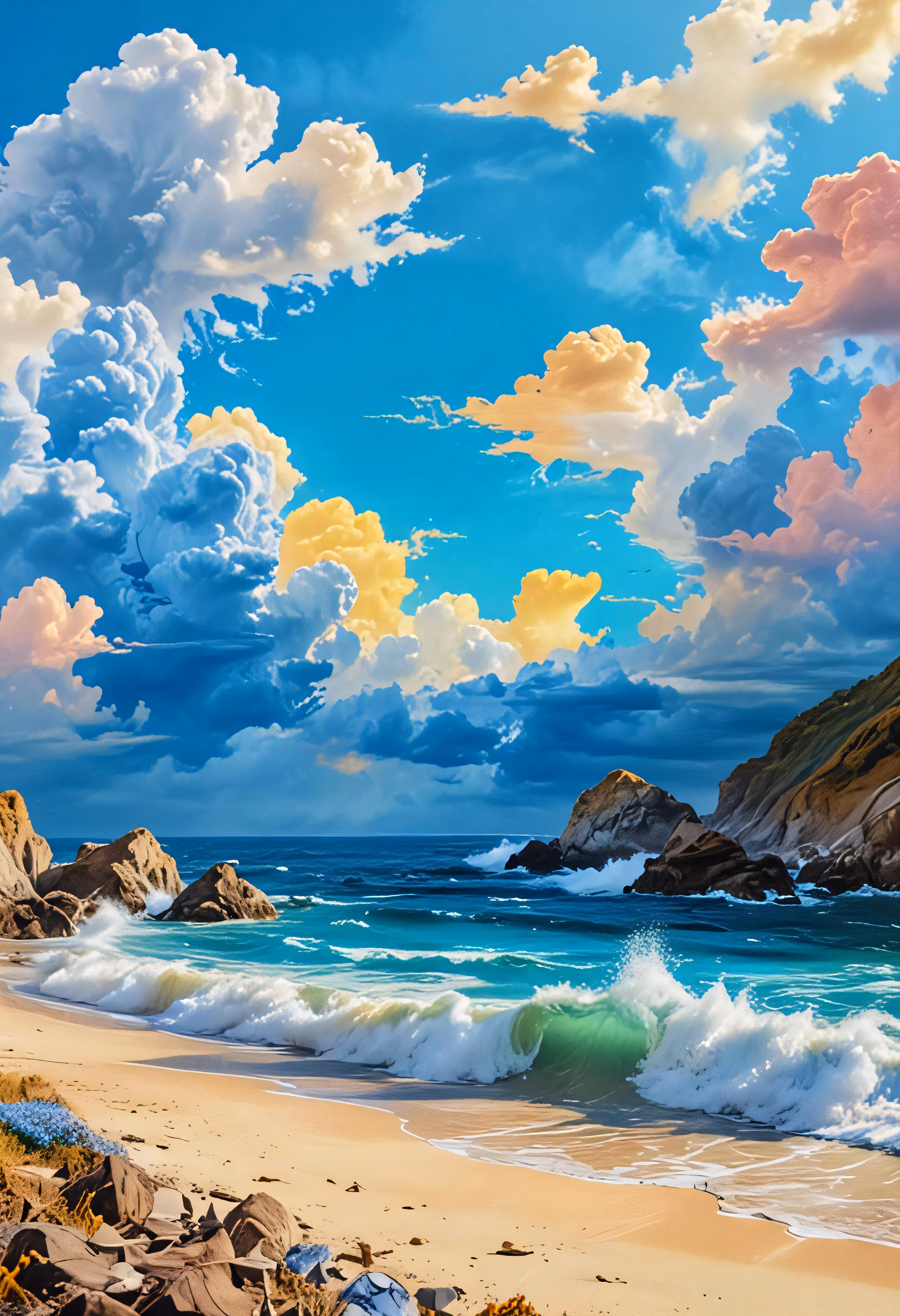 High resolution picture, free to use, a painting of the ocean and clouds with a sandy beach